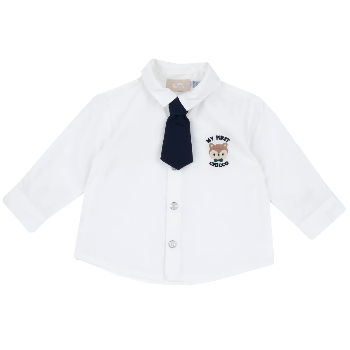 Camicia CHICCO con ricamo e logo ricamato applicato in colore a contrasto, chiusura con clips, cravatta in colore a contrasto removibile mediante bottoncini.