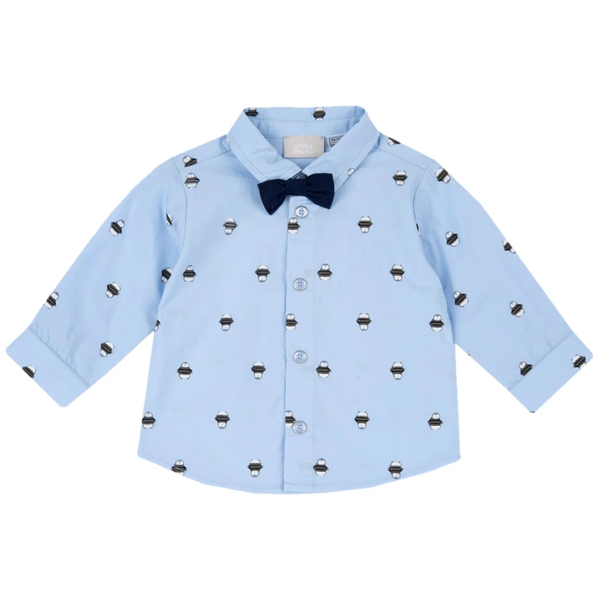 Camicia CHICCO in cotone a fantasia in colore a contrasto, chiusura con bottoni, papillon applicato removibile mediante bottoncini.