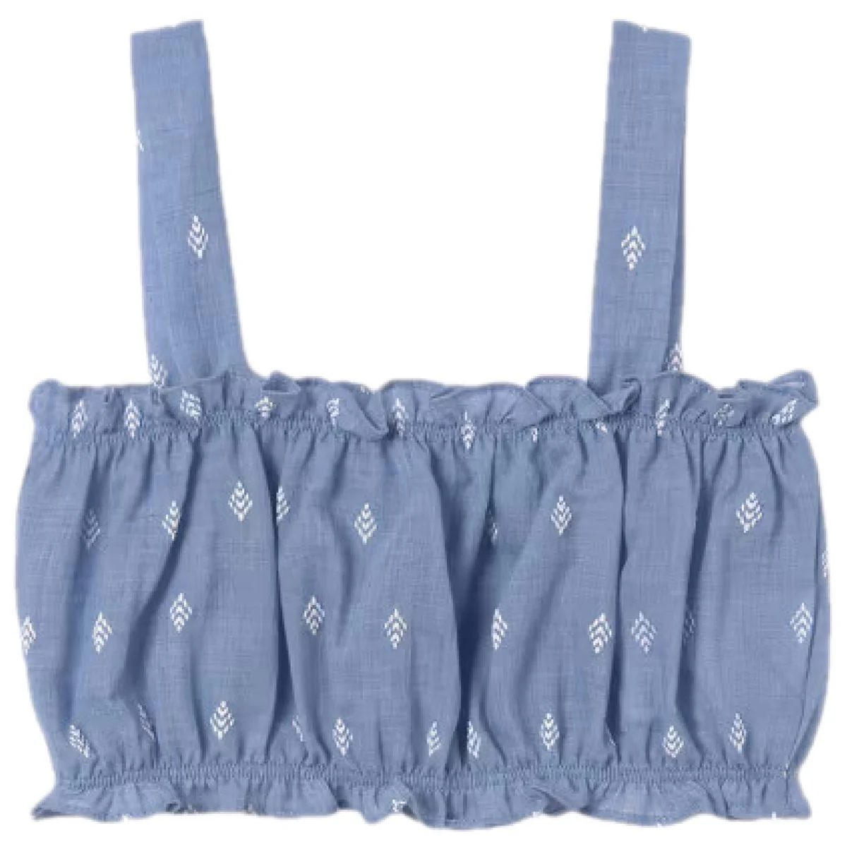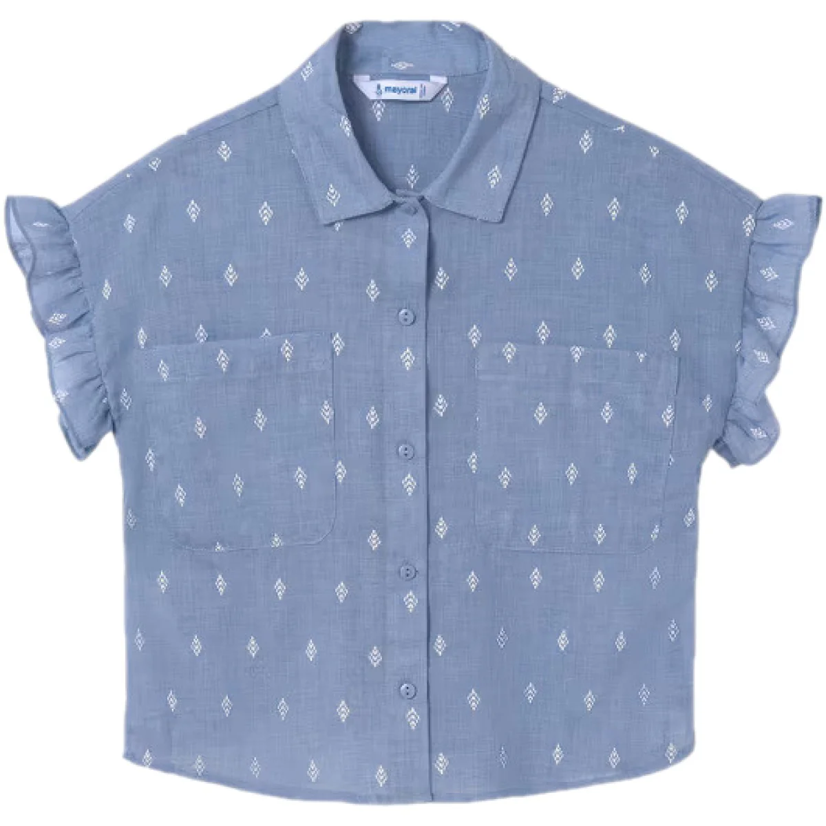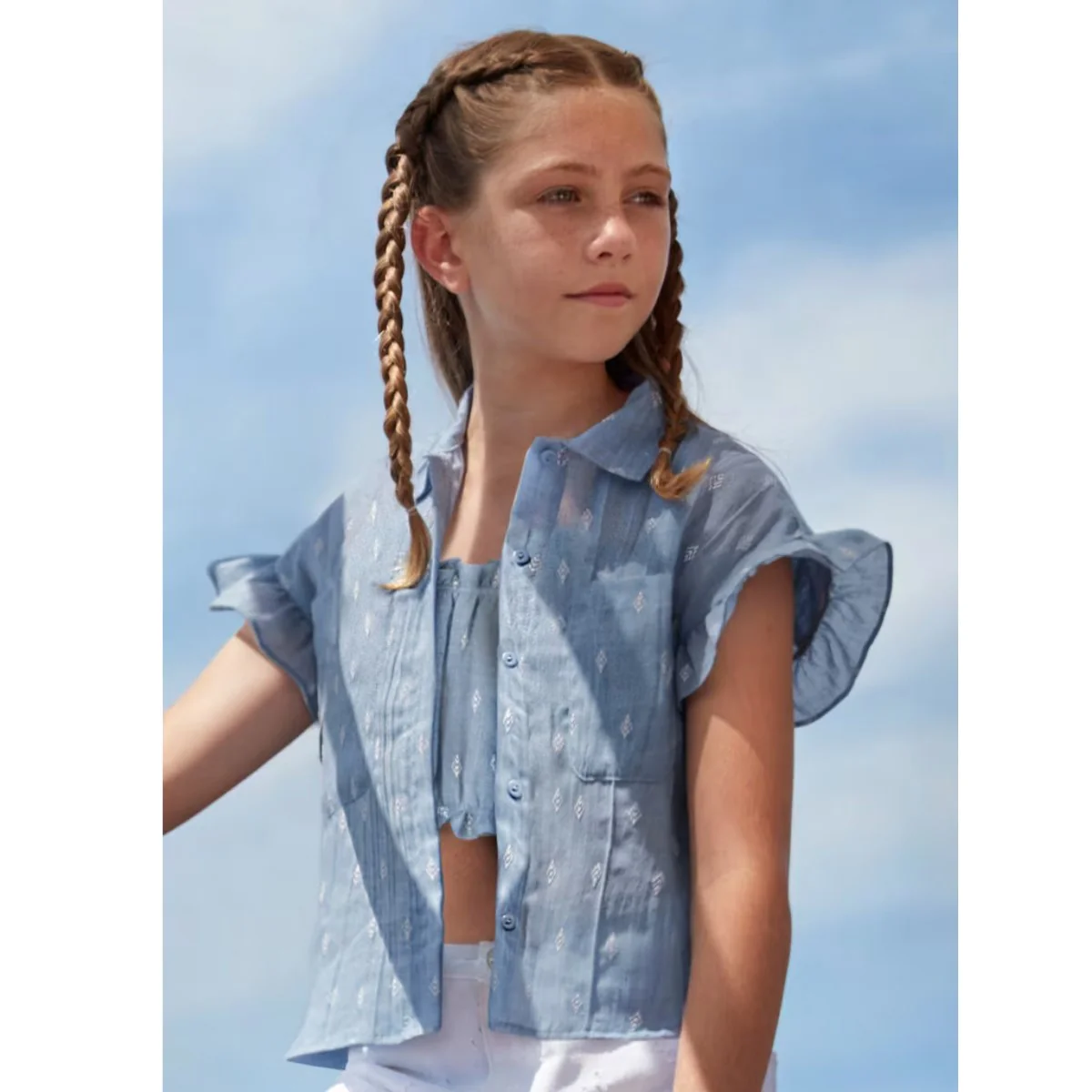 Camicia e top MAYORAL in tessuto a fantasia in colore a contrasto; top con inserti elastici e bretelline, camicia con tasche applicate, voilant al giro manica e chiusura con bottoncini.