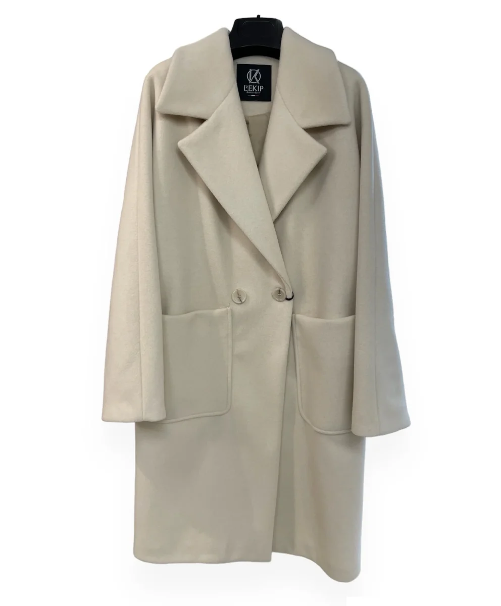 Cappotto trend di questa stagione. Vestibilit� oversize, spalla raglan con maniche molto ampie. Tasche quadrate applicate, chiusura doppio petto con bottoni in tinta. Veste molto comodo. Composizione tessuto 90% poliestere 10% viscosa, fodera 100% poliestere.