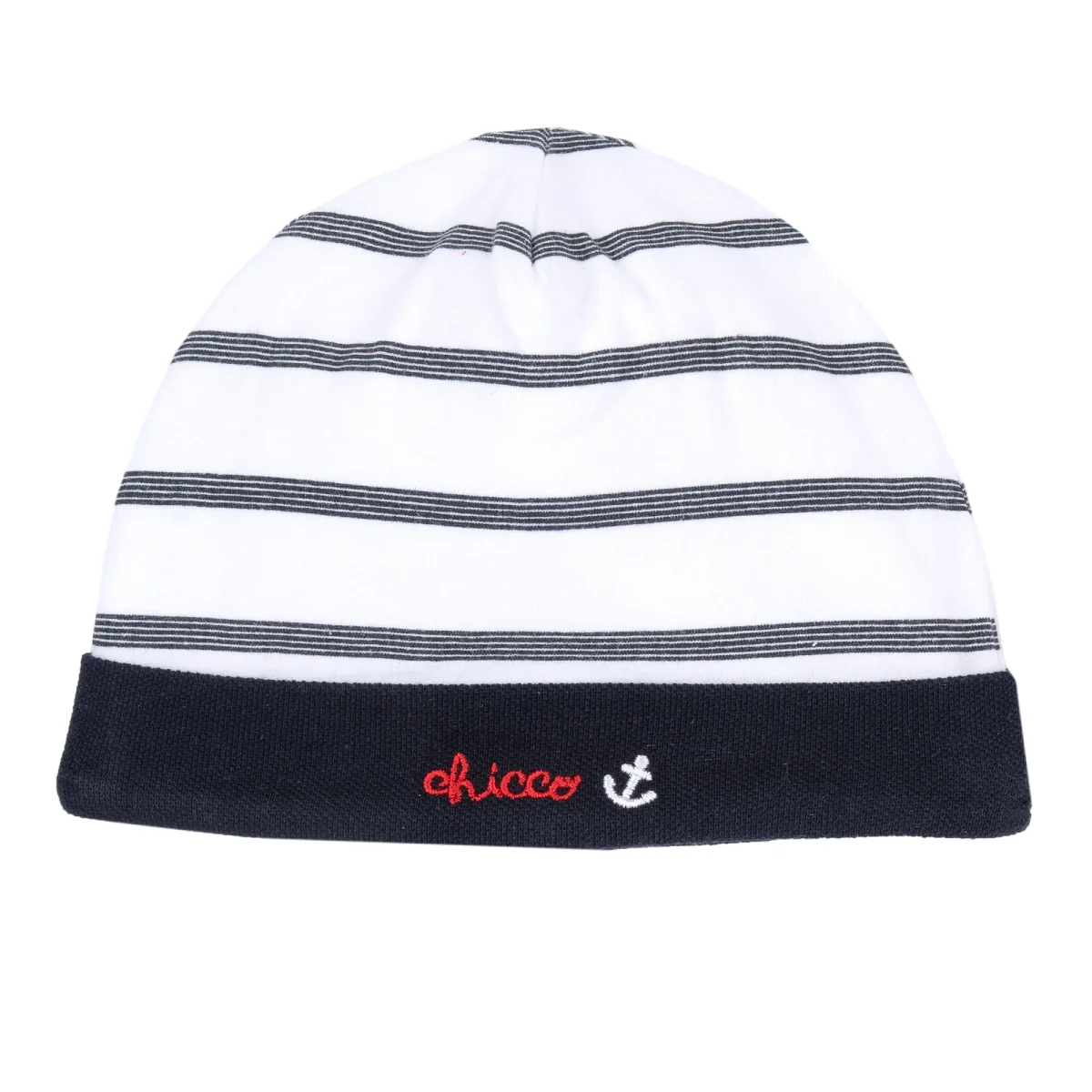 Cappello CHICCO in cotone a fantasia rigata, logo ricamato applicato in colore a contrasto.