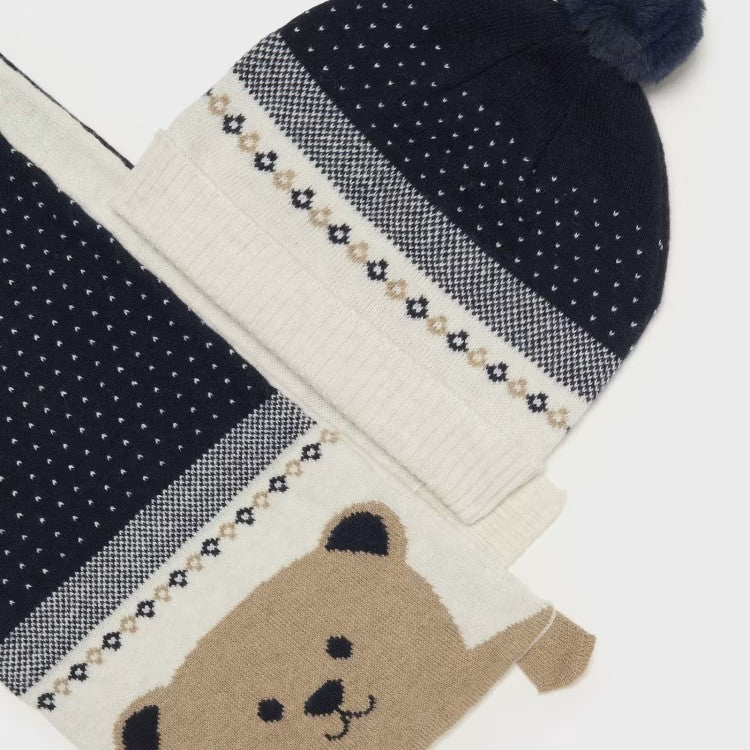 Cappello e sciarpa MAYORAL in misto lana a fantasia in colori a contrasto, pom pon in ecopelliccia applicato al cappello.
