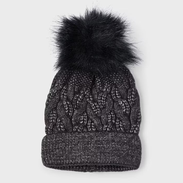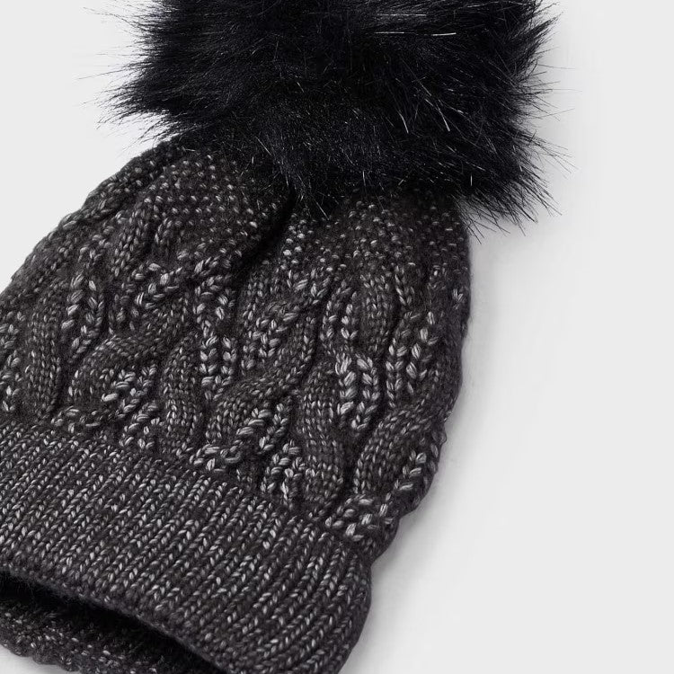 Cappello MAYORAL in maglia lavorato a fantasia trecce, pom pon in ecopelliccia applicato.