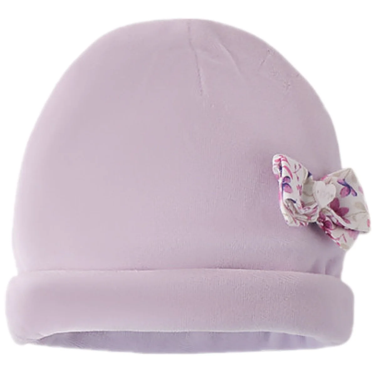 Cappello MINIBANDA in ciniglia con risvolto, fiocco applicato laterale a fantasia floreale con logo cuore applicato.