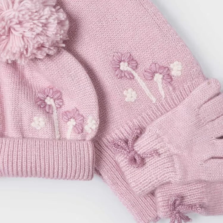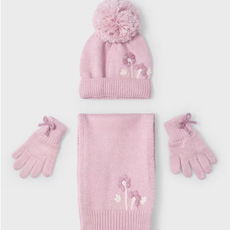Completo MAYORAL composto da cappello con pom pon, sciarpa e guanti in caldo tessuto laminato con ricami e fiocchetti applicati in colore a contrasto.