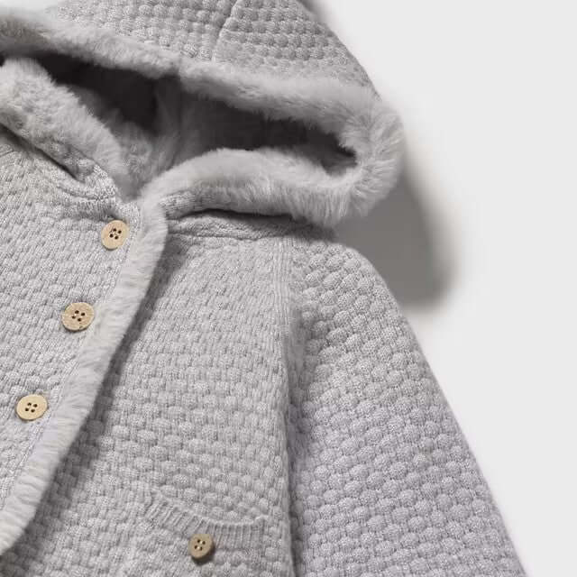 Cappottino in tessuto MAYORAL con rifiniture in ecopelliccia , chiusura con bottoni. Pompon sul cappuccio.