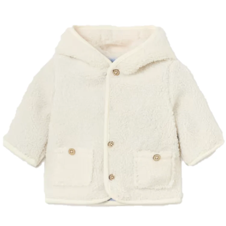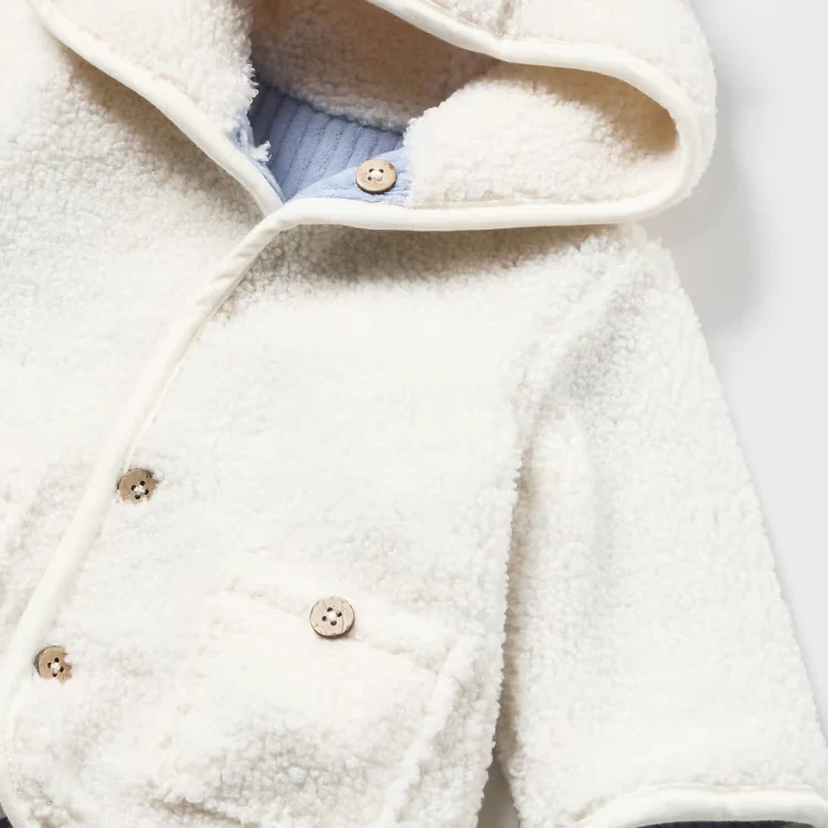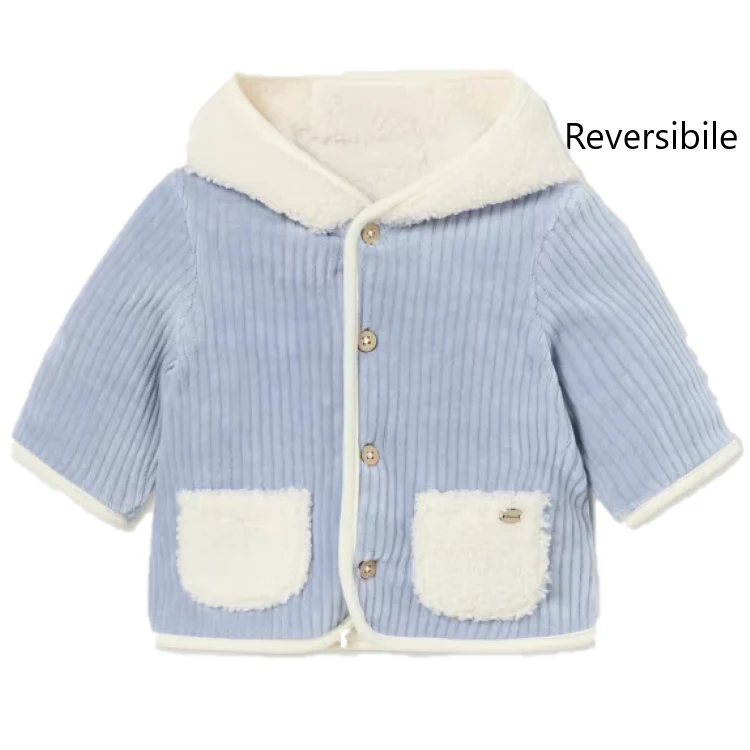 Cappottino neonato MAYORAL modello reversibile con cappuccio e rifiniture a contrasto.