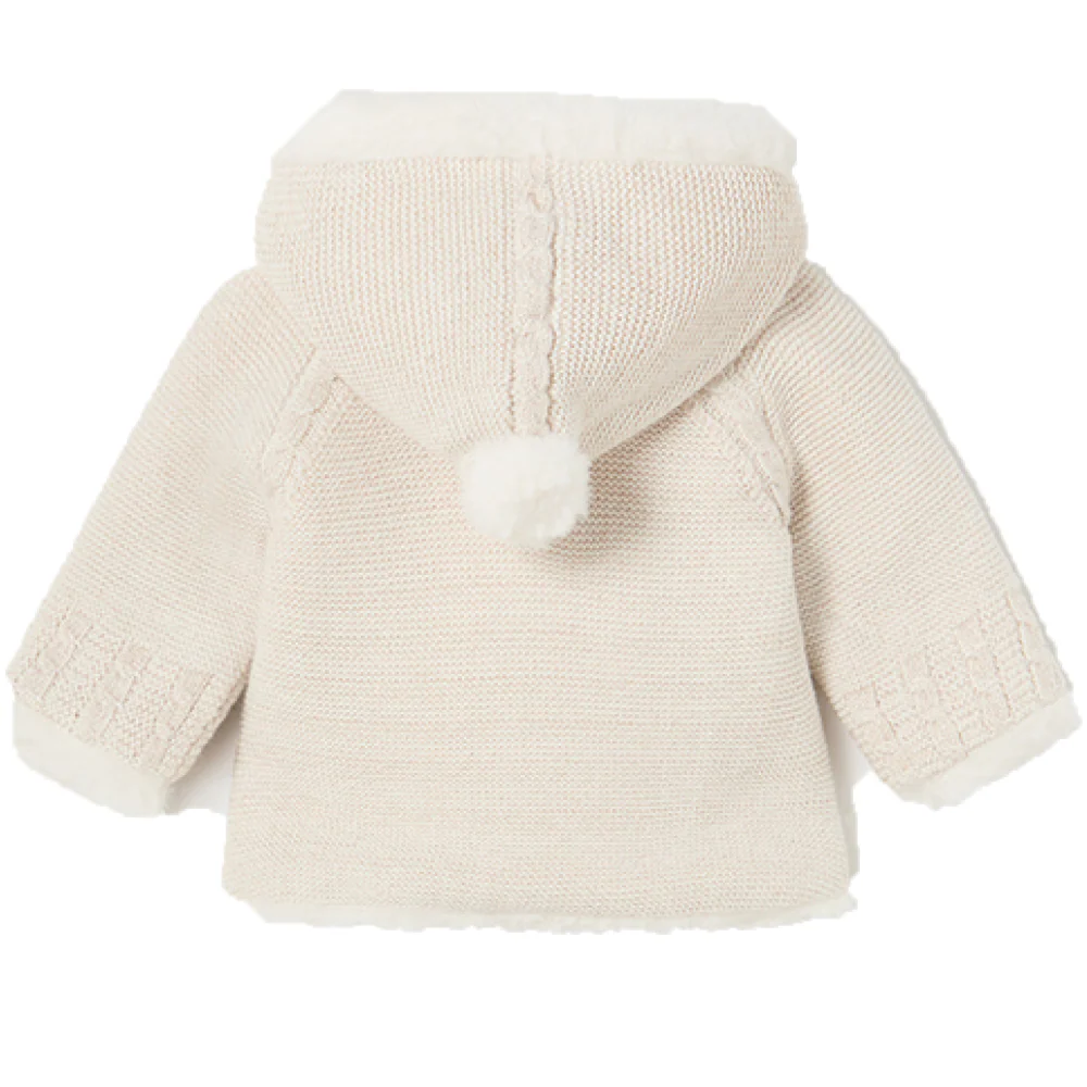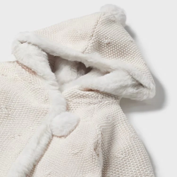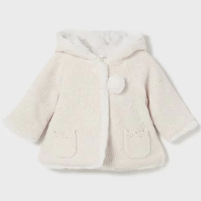 Cappottino MAYORAL con interno in ecopelliccia , pom pon applicato al cappuccio , chiusura con bottoni a clips.