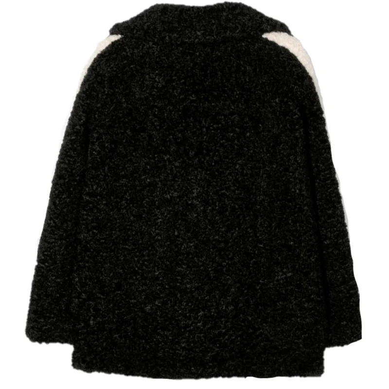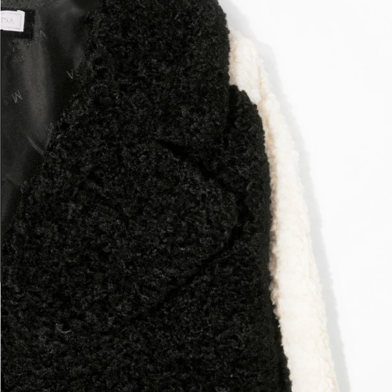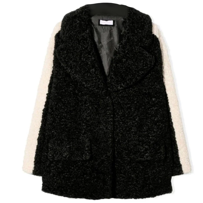 Cappotto MONNALISA in tessuto peluche effetto TEDDY con chiusura clips tasche con battenti bande in colore a contrasto sulle maniche colletto revers fodera interna logata.