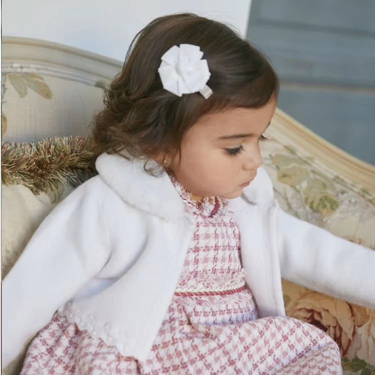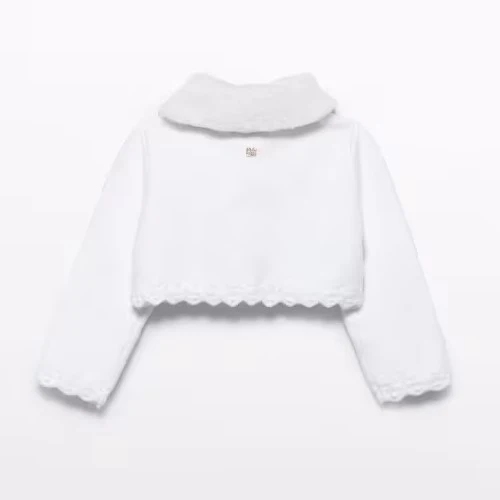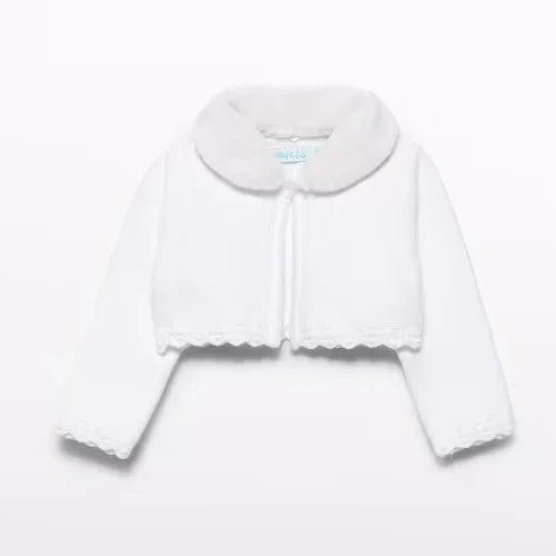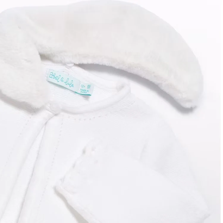 Cardigan ABEL&LULA in maglia lavorata con trafori e ricami, colletto in ecopelliccia removibile mediante bottoncini, chiusura con bottoncino.