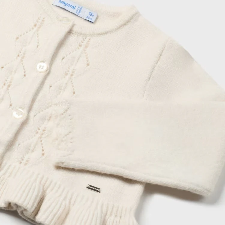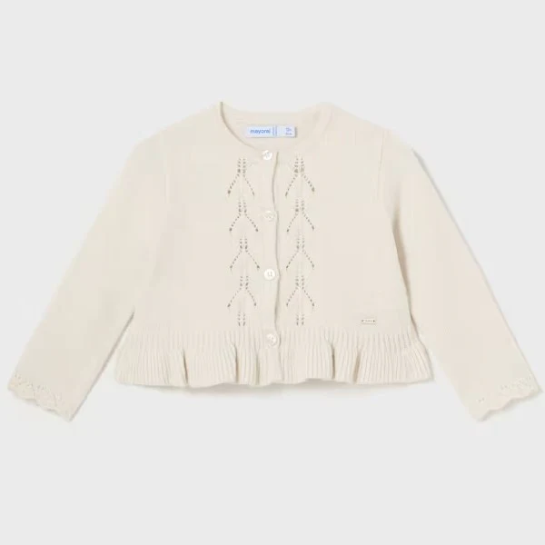 Cardigan MAYORAL con ricami traforati e voilant applicato, chiusra con bottoncini, logo in metallo applicato.