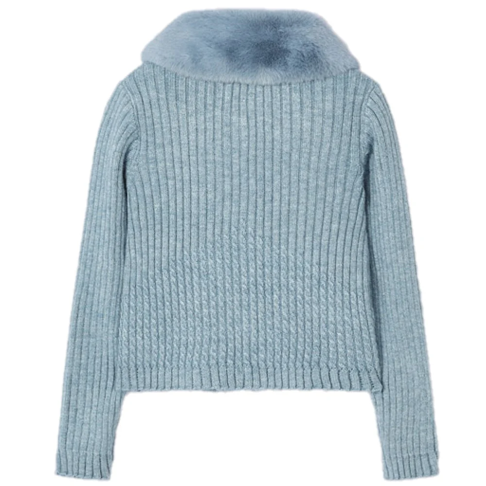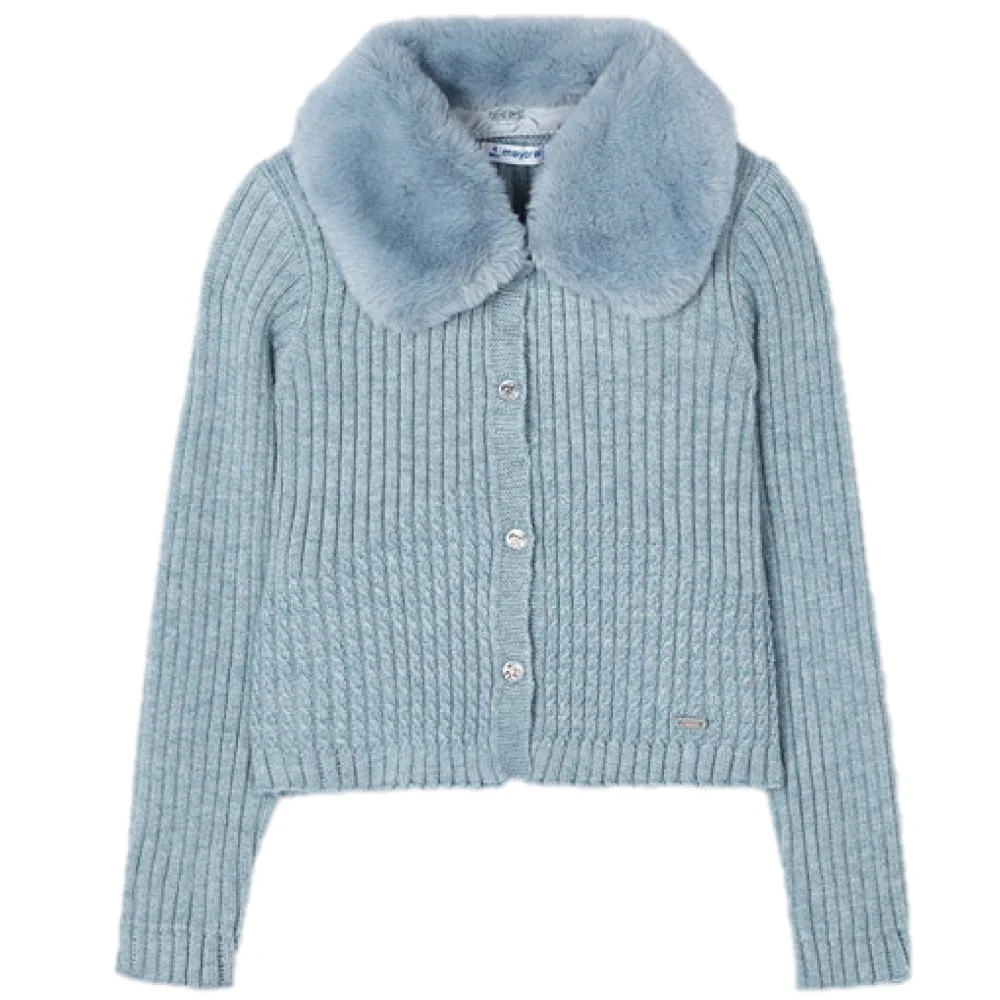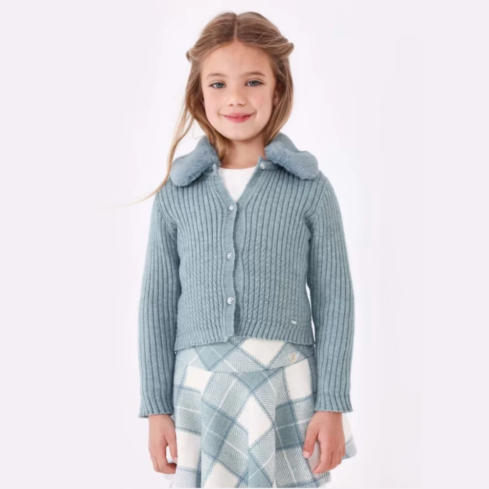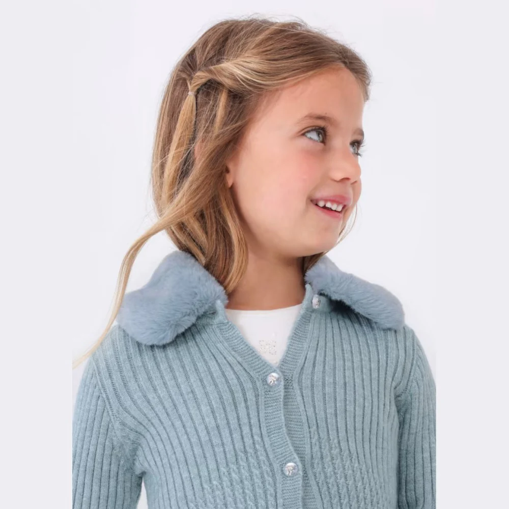 Cardigan MAYORAL in morbido tessuto lavorato con colletto in ecopelliccia removibile mediante bottoncini chiusura con bottoncini fiorellino.