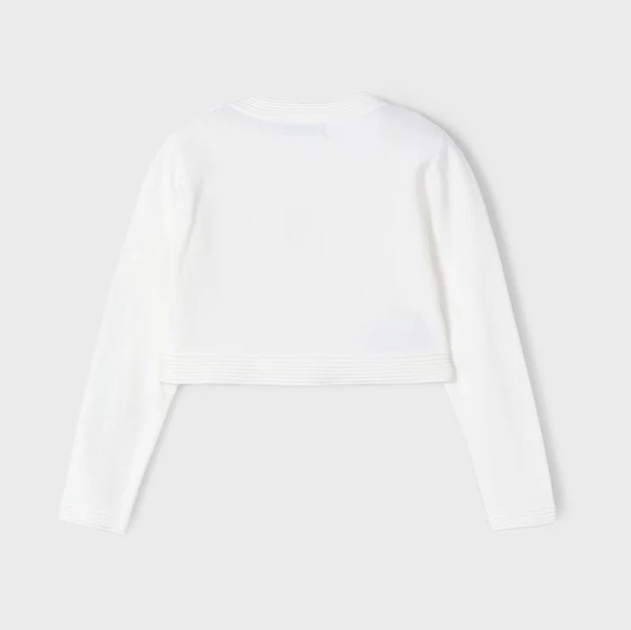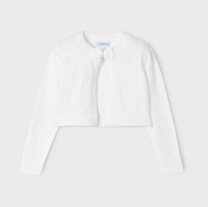 Cardigan MAYORAL in filo con chiusura bottoncino e finto fiocchetto applicato.