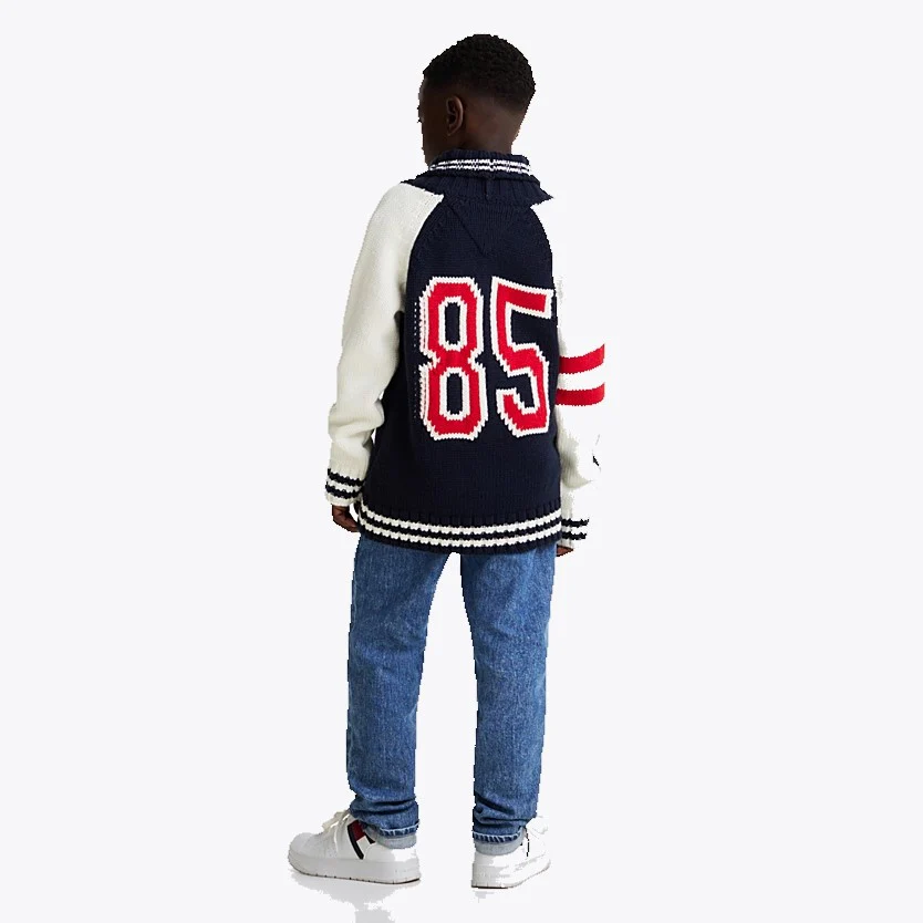 Cardigan Tommy Hilfigerin misto lana , chiusura con bottoni , linea college , logo ricamato.