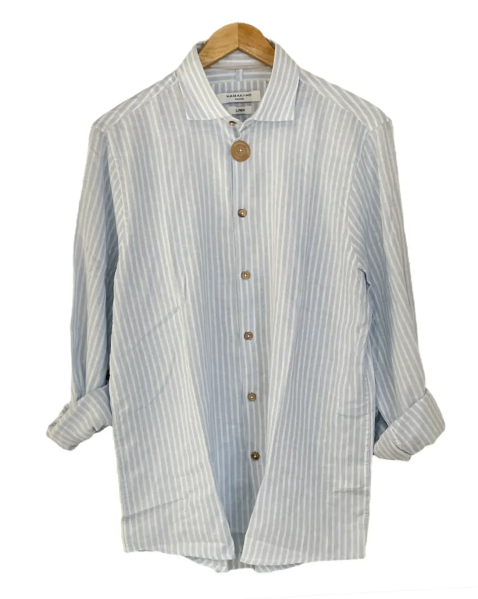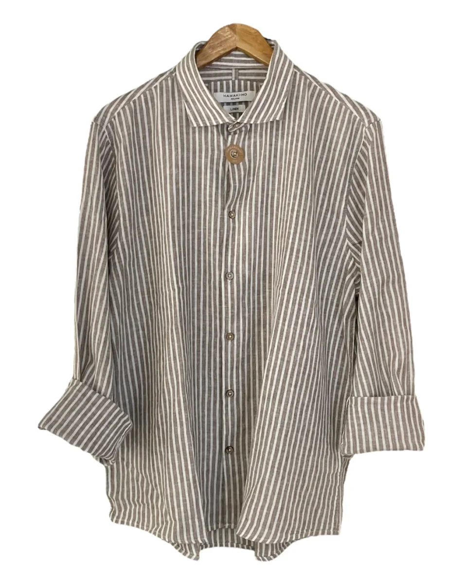 Camicia in tessuto 100% puro lino. Colletto piccolo, chiusura con bottoni effetto legno. Motivo righe strette. Maniche lunghe con polsini chiusi da bottoni. Vestibilità comfort.