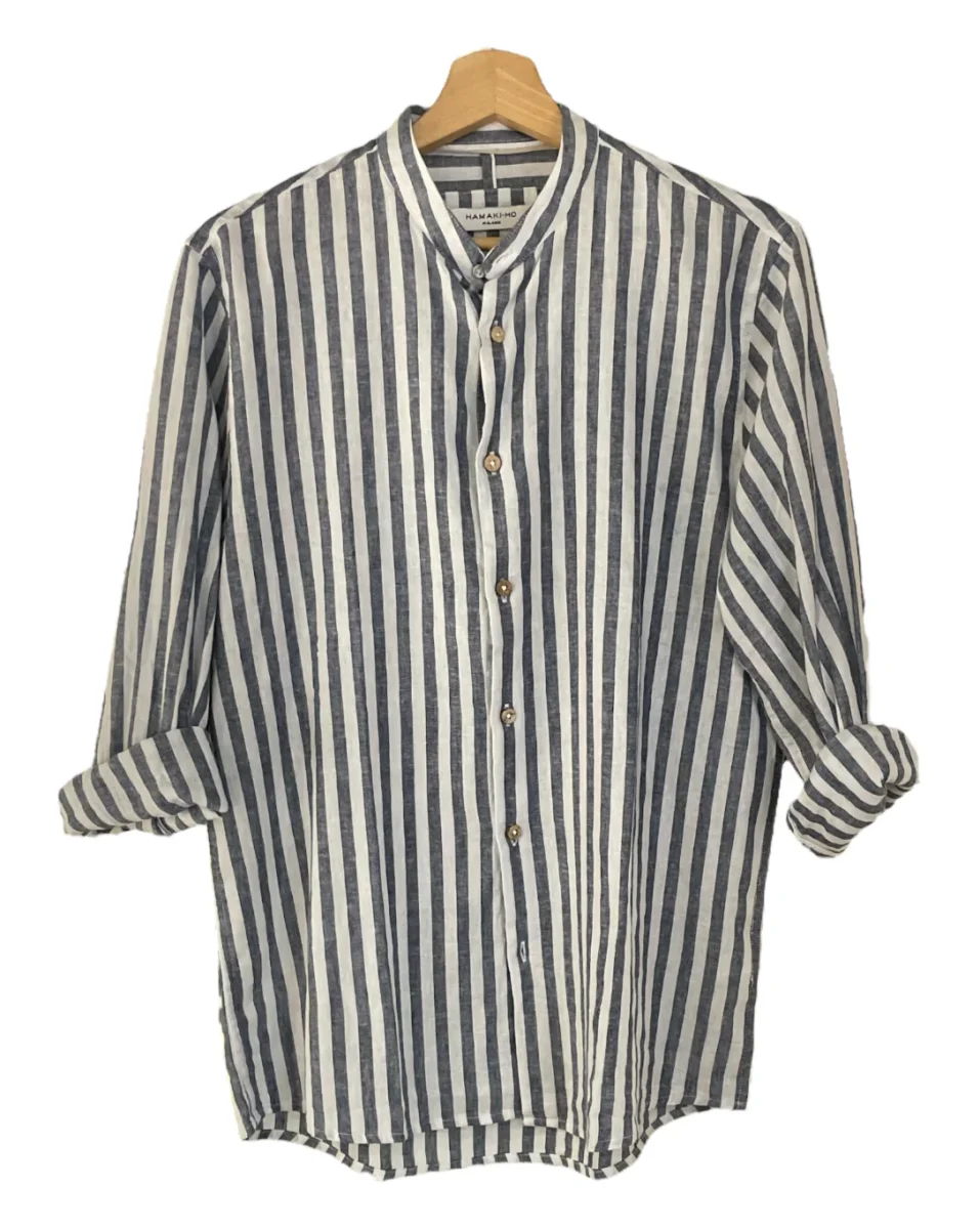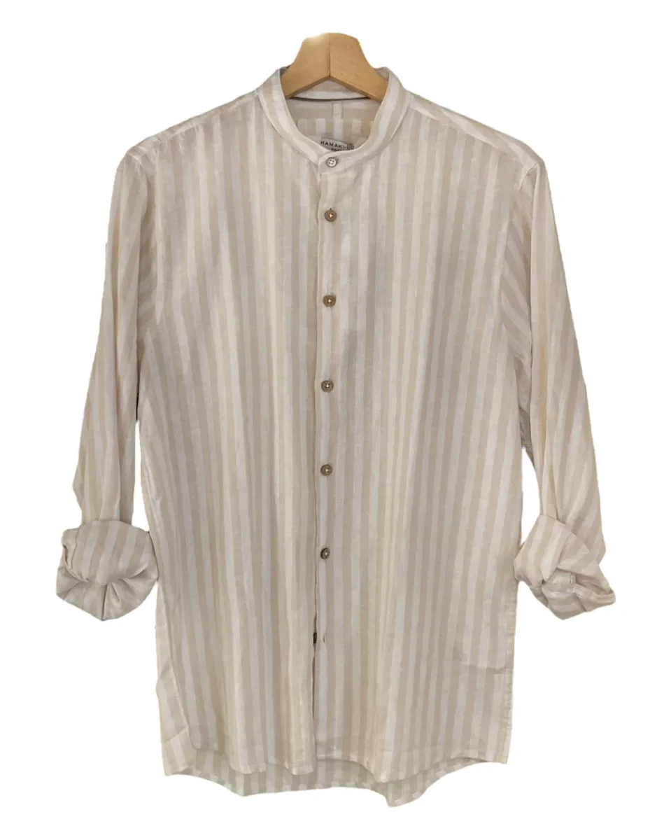 Camicia in tessuto 100% puro lino. Collo coreano, chiusura con bottoni effetto legno. Motivo a righe larghe. Maniche lunghe con polsini chiusi da bottoni. Vestibilità comfort.