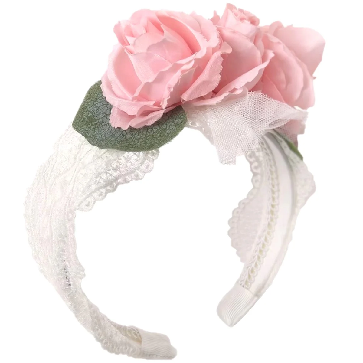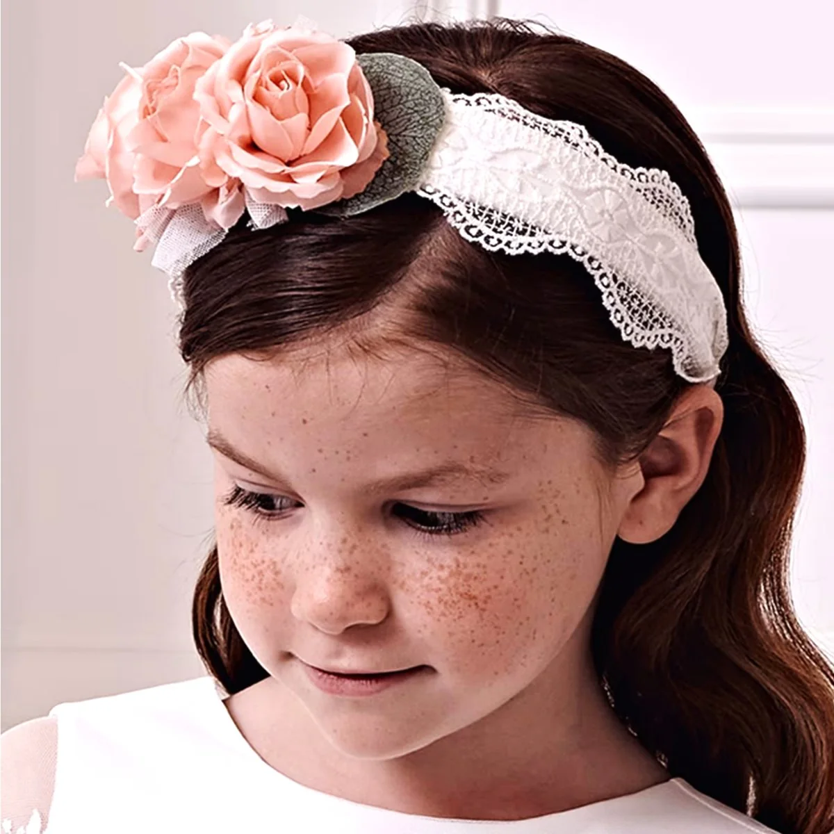 Cerchietto ABEL & LULA con fiori applicati e tulle ricamato.