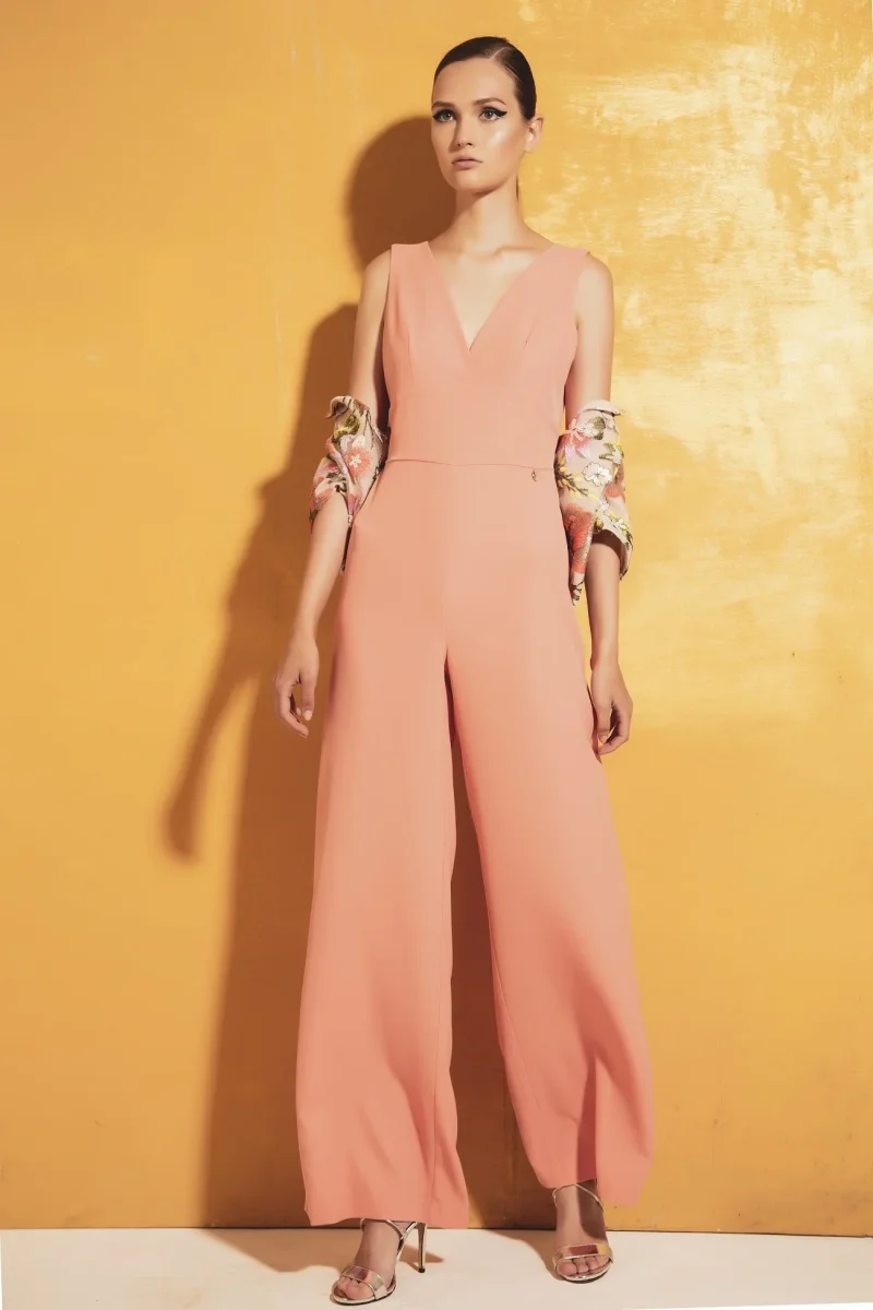 Tuta intera in tessuto crêpe. Scollo a V, taglio in vita e pantaloni a palazzo. Vestibilità sagomata. Chiusura sulla schiena con zip a scomparsa. La modella indossa la taglia 42. Composizione tessuto 100% poliestere.