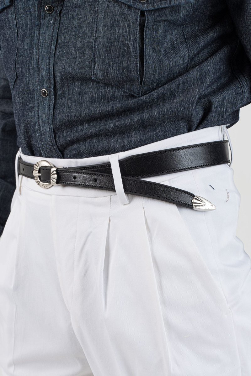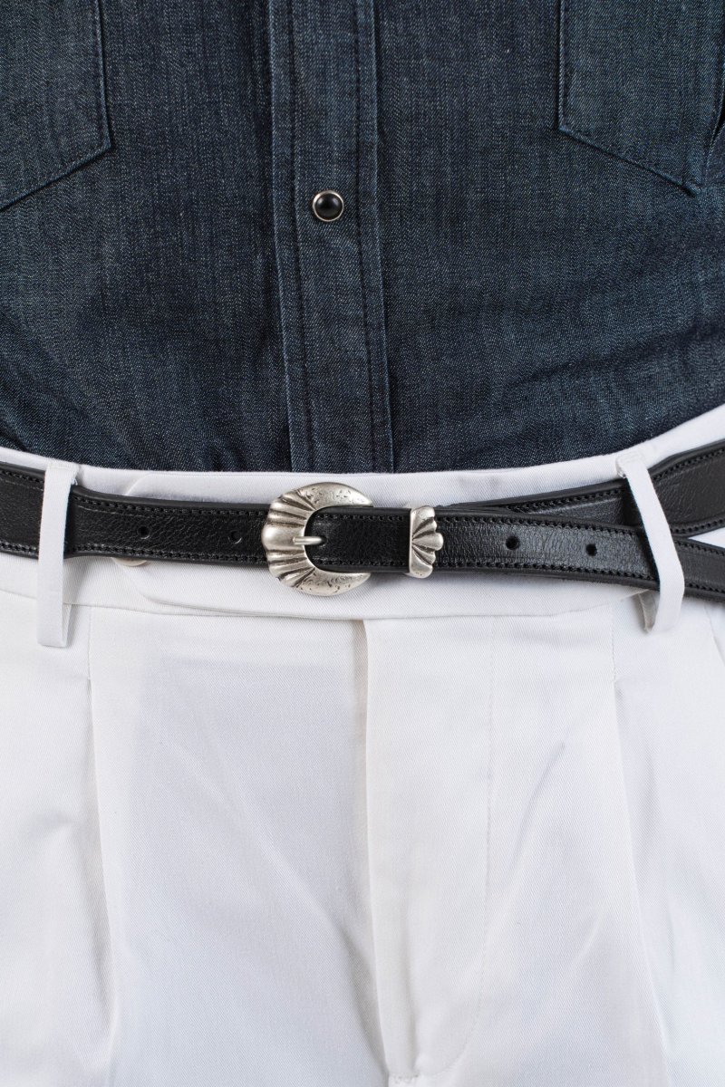 Questa cintura in pelle è un accessorio che unisce eleganza e carattere grazie al suo design ispirato allo stile western. Realizzata in pelle, è rifinita con una fibbia in metallo argentato decorata, che conferisce un tocco di unicità e stile vintage. Il dettaglio della punta metallica sagomata completa l’aspetto raffinato e deciso della cintura, rendendola perfetta per essere abbinata sia con jeans che con pantaloni sartoriali, per un look versatile e sempre alla moda.
