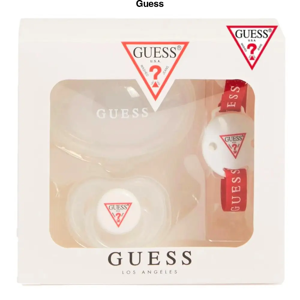 Set GUESS composto da :-Ciuccio logato anatomico in silicone con cappuccio-Custodia trasparente logata per ciuccio-Babyclips logata