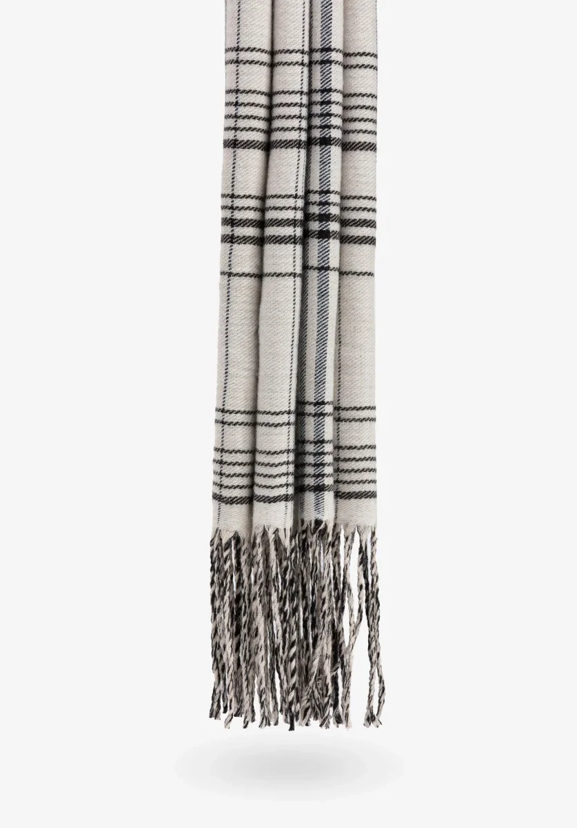 Sciarpa in tessuto misto viscosa double face. Lato 1 fantasia galles, lato 2 micro pied de poule. Bordi con frange.