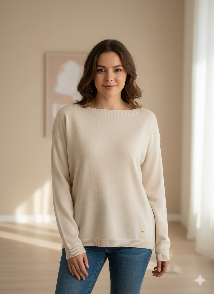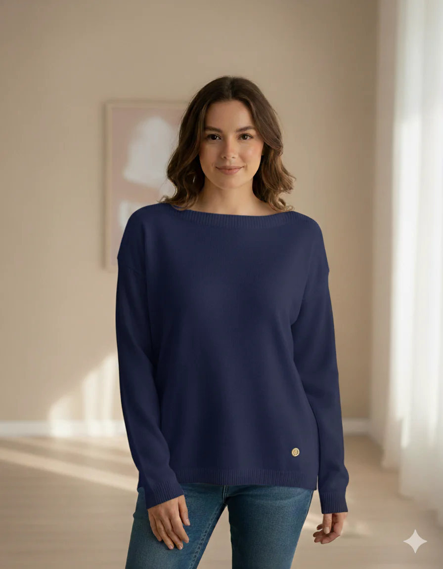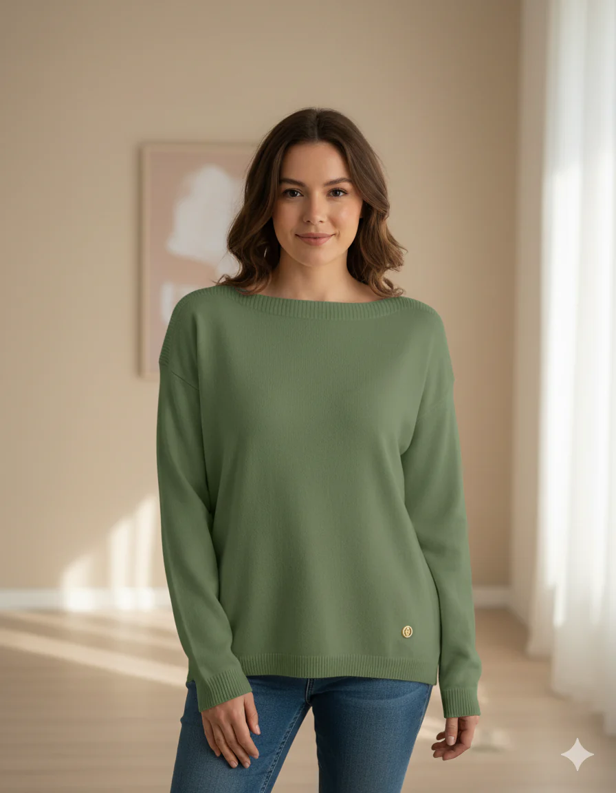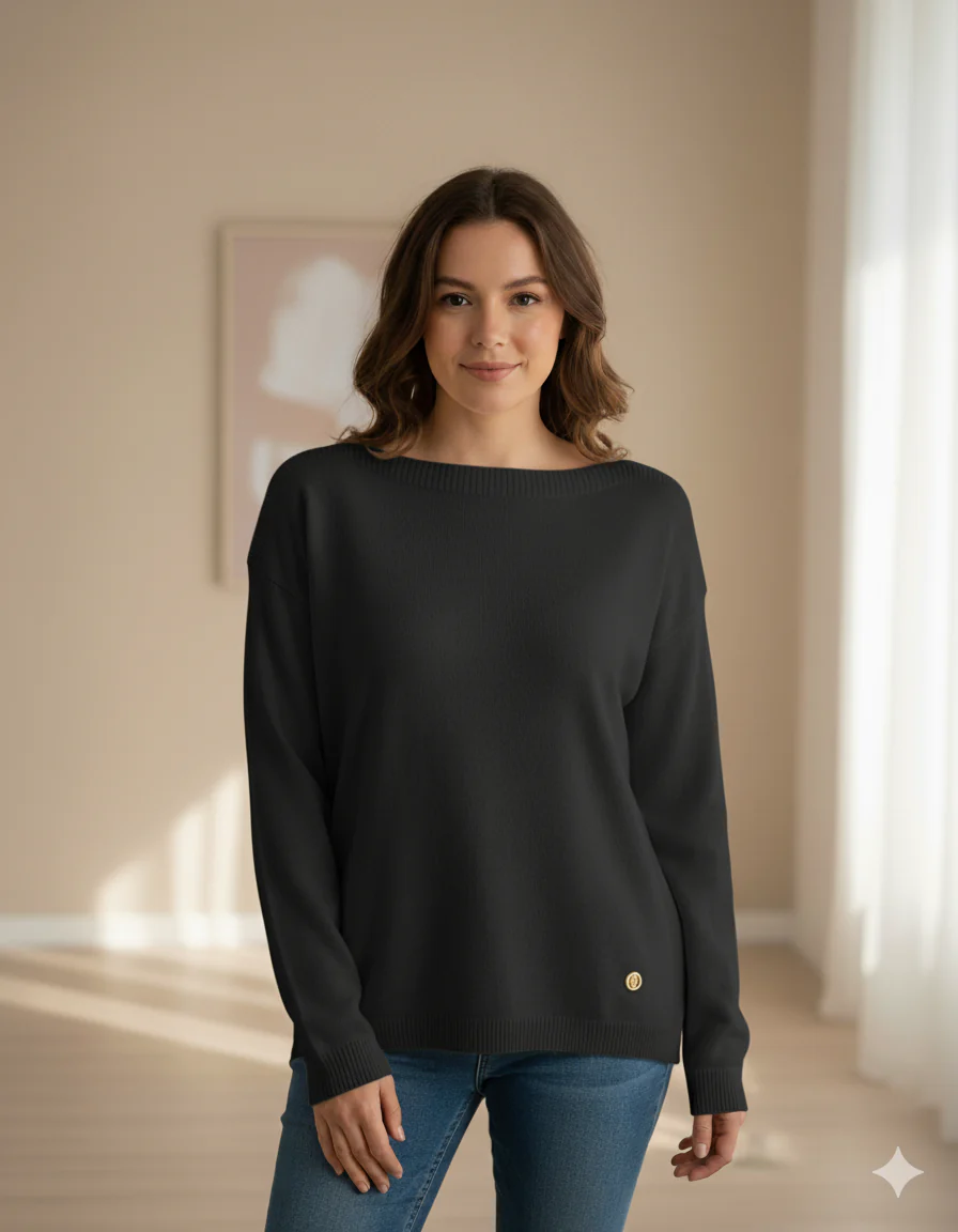 Maglia donna basica in morbido tessuto misto viscosa. Scollo a barca con bordo largo a costine che continuano fino alla spalla, spalla raglan, maniche lunghe. Vestibilità comoda. Taglia in foto I. Composizione tessuto 51% viscosa 28% poliestere 21% nylon.