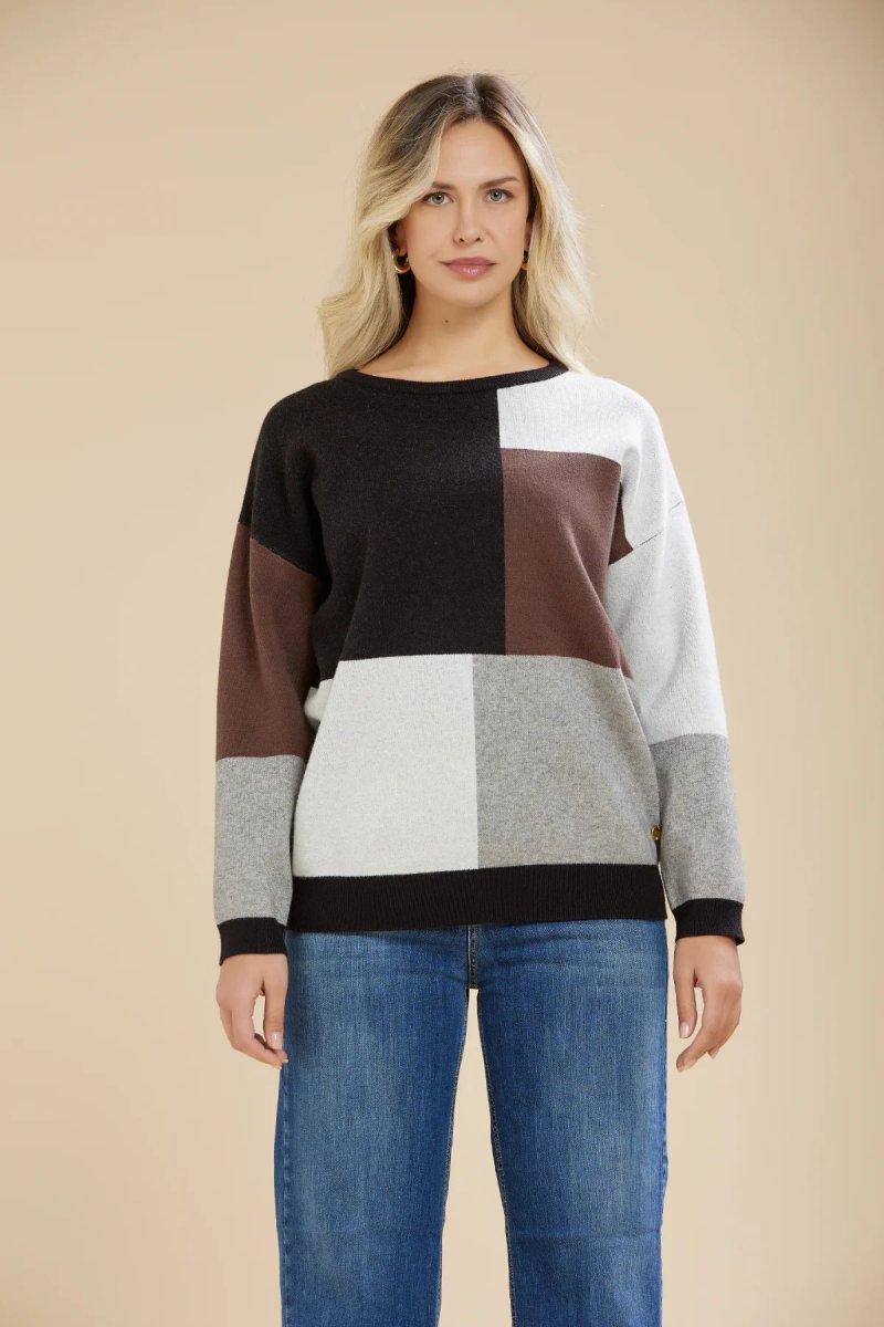 Maglia over modello felpa in tessuto misto viscosa. Girocollo regolare rifinito a costine. Fantasia color-block multicolor. Polsini e fondo tinta unita. Vestibilità comoda. Taglia in foto I. Composizione tessuto 51% viscosa 28% poliestere 21% nylon.