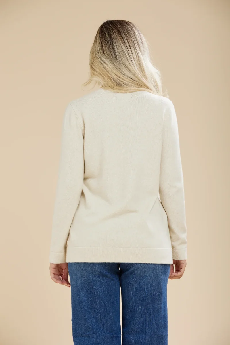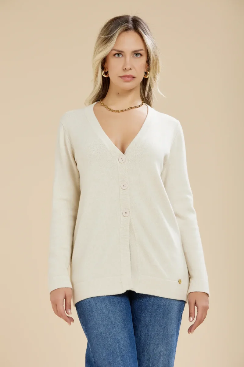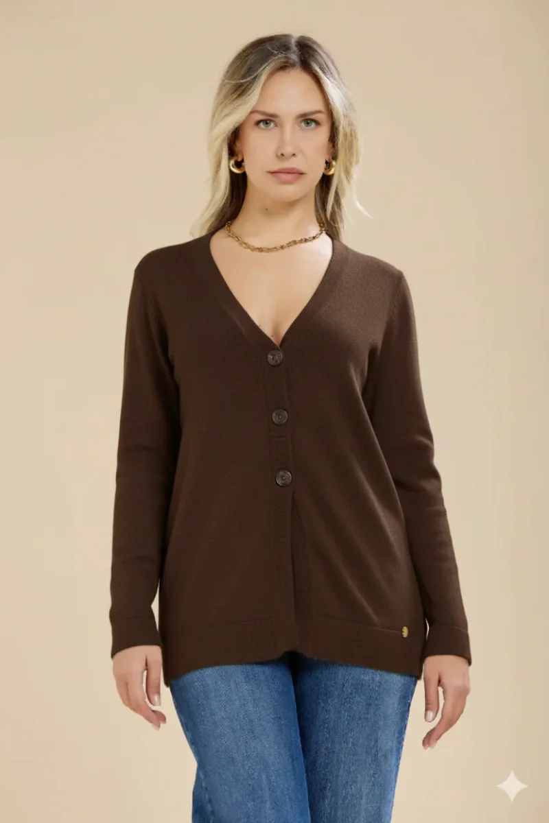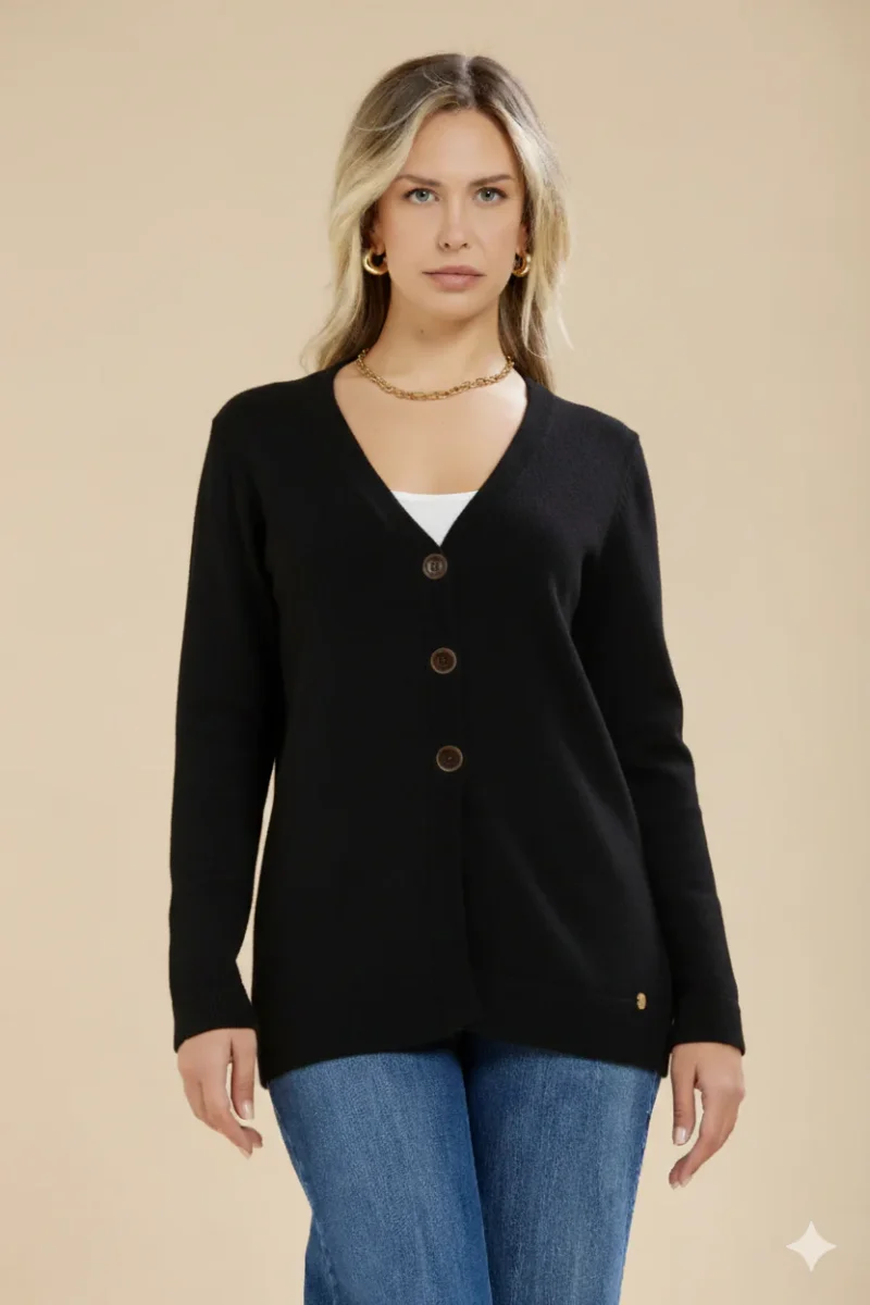 Cardigan donna basico in tessuto misto viscosa. Scollo a punta, chiusura con bottoni in tinta. Vestibilità comoda. Taglia in foto I. Composizione tessuto 51% viscosa 28% poliestere 21% nylon.