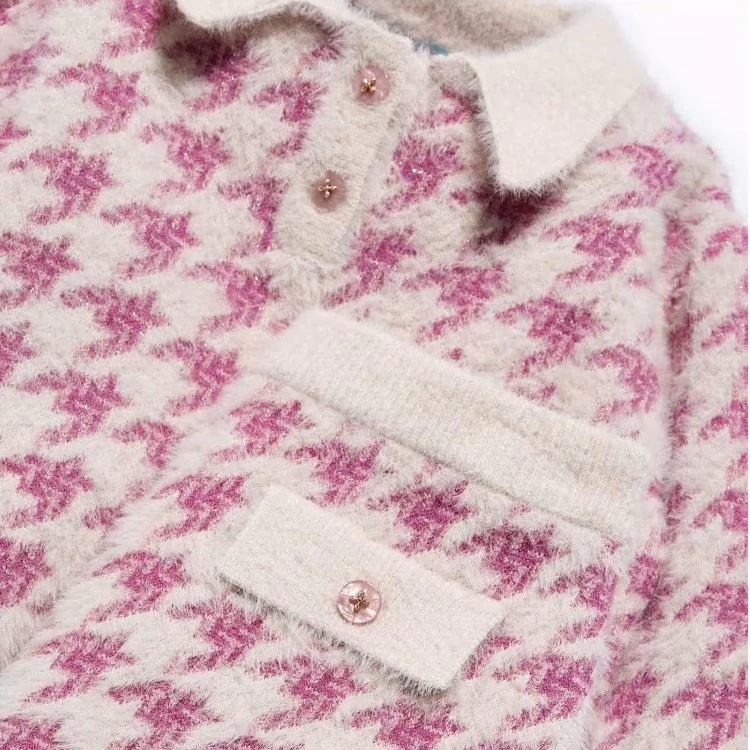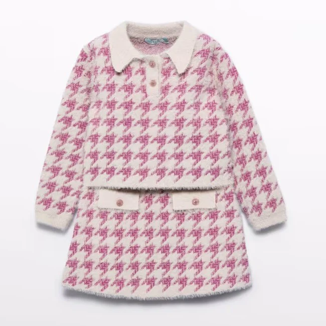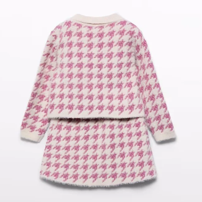 Completo ABEL&LULA composto da maglioncino a fantasia pied de poule laminata con colletto e chiusura con bottoncini; gonna in coordinato con finte tasche con bottoncini applicati ed elastico in vita.