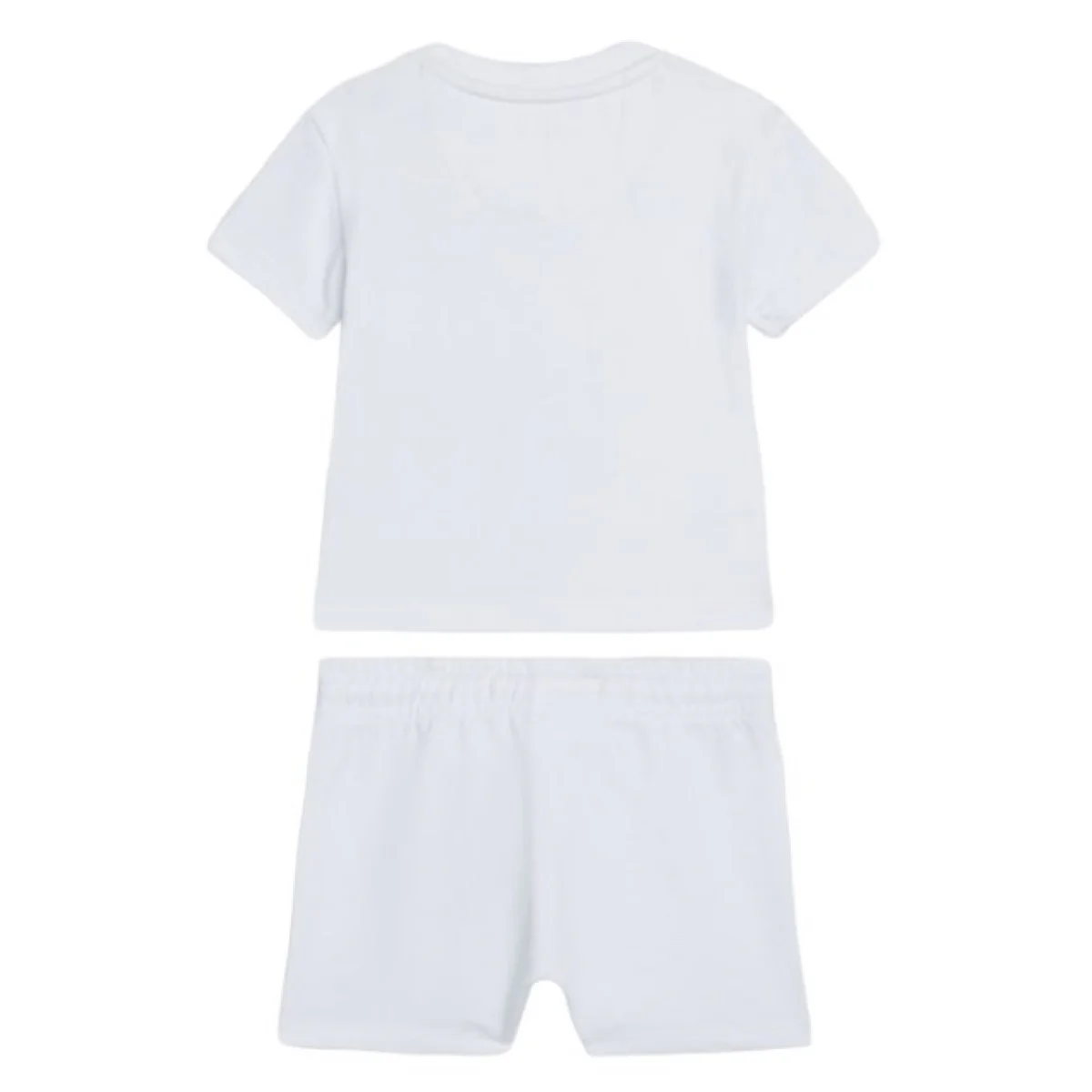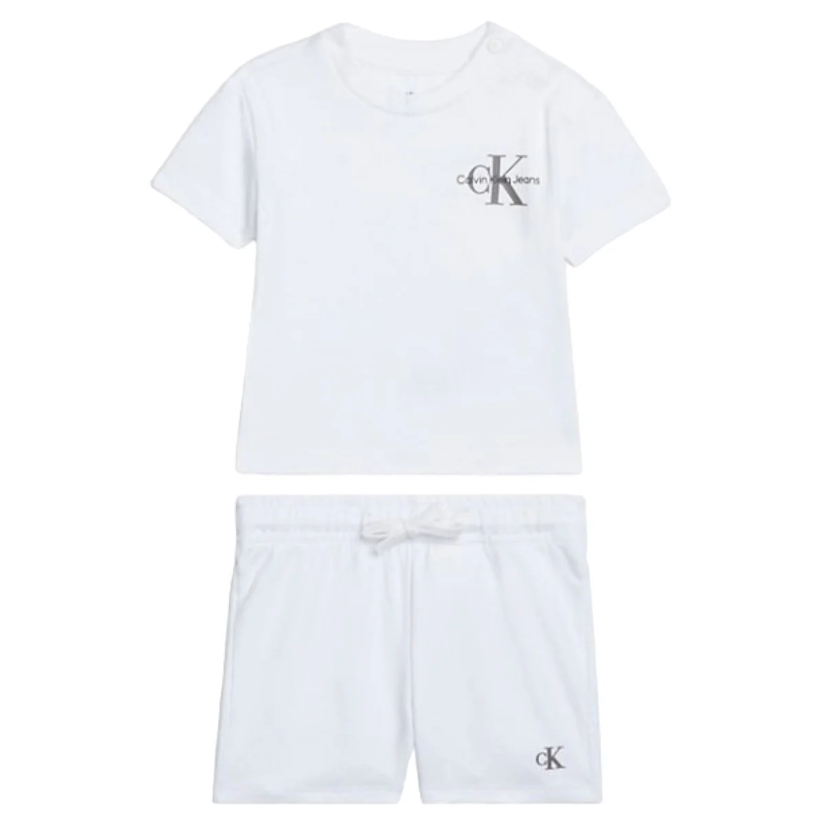 Completo CALVIN KLEIN in cotone composto da t-shirt con logo monogram stampato e chiusura clips su spalla fino alla taglia 24mesi, bermuda in cotone con elastico in vita, logo stampato.