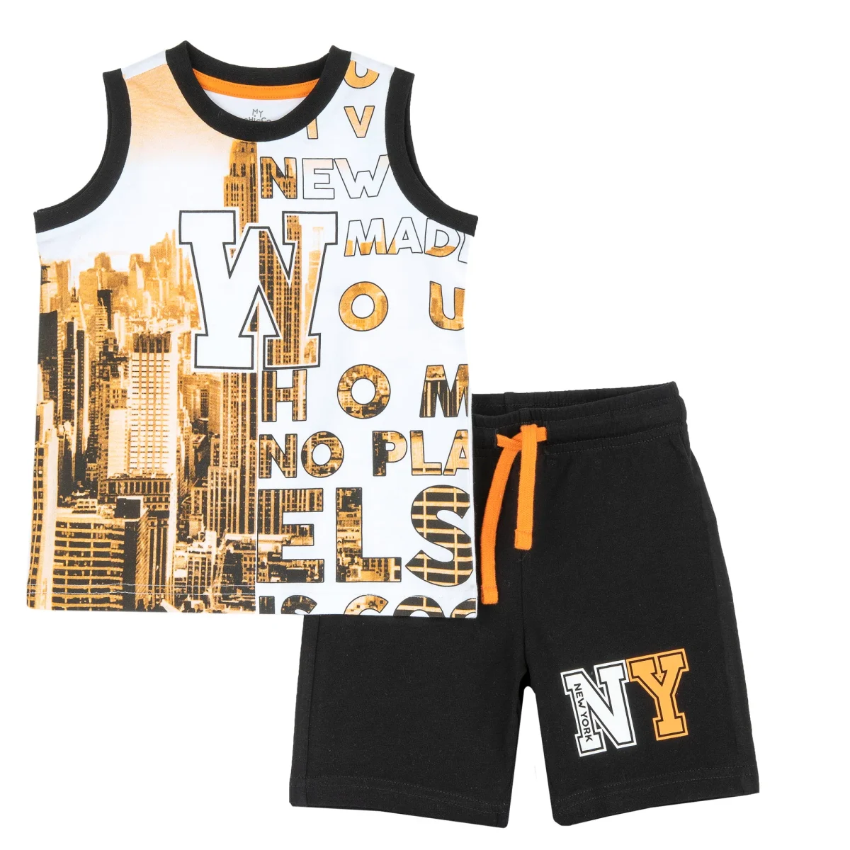 Completo CHICCO con t-shirt giro manica in cotone a fantasia stampata in colori a contrasto, e bermuda in cotone con elastico e laccetto regolabile in vita, stampa applicata, taschino sul retro.