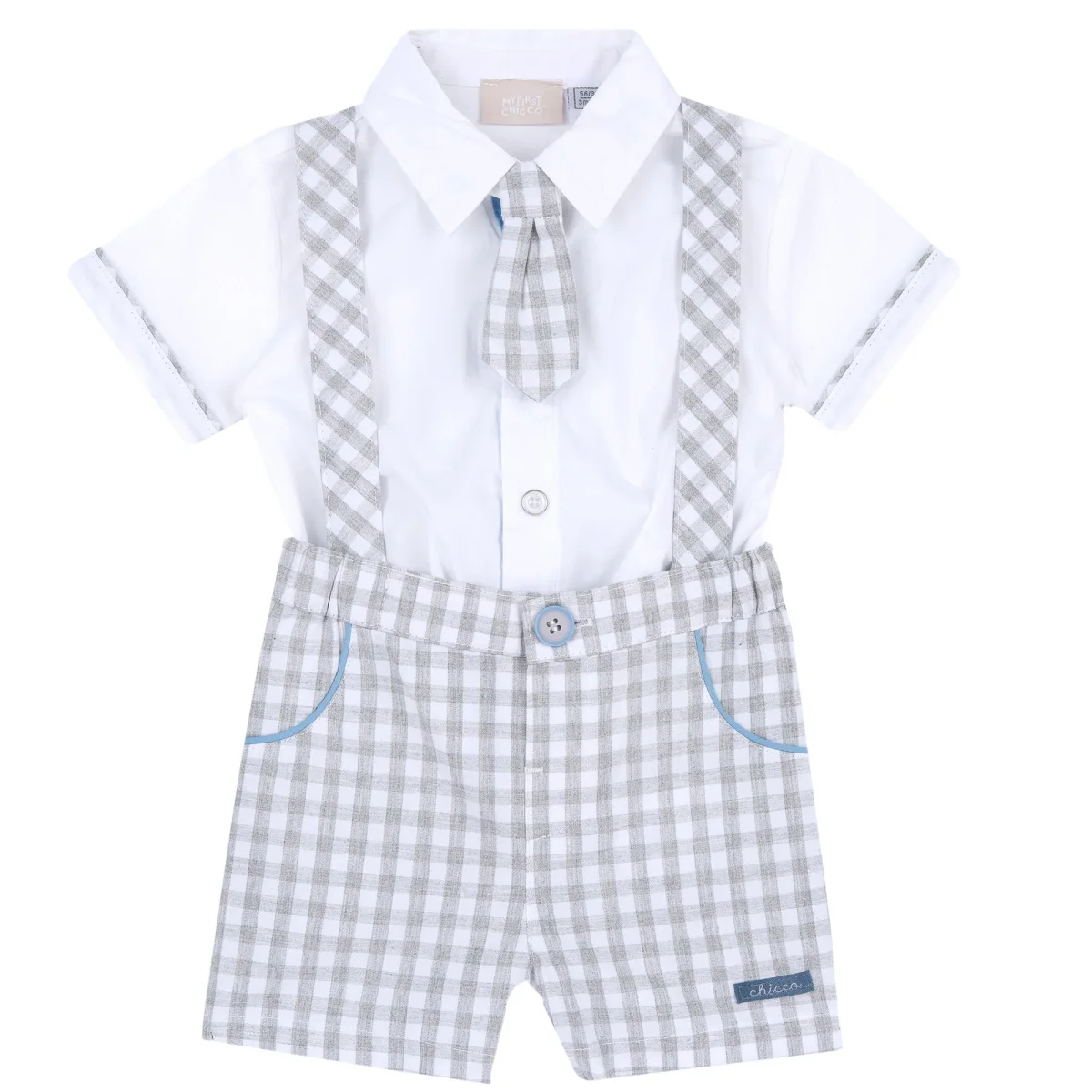 -camicia in cotone con chiusura clips, rifiniture alle maniche a fantasia a contrasto, cravatta a fantasia quadretti removibile mediante bottoncini;