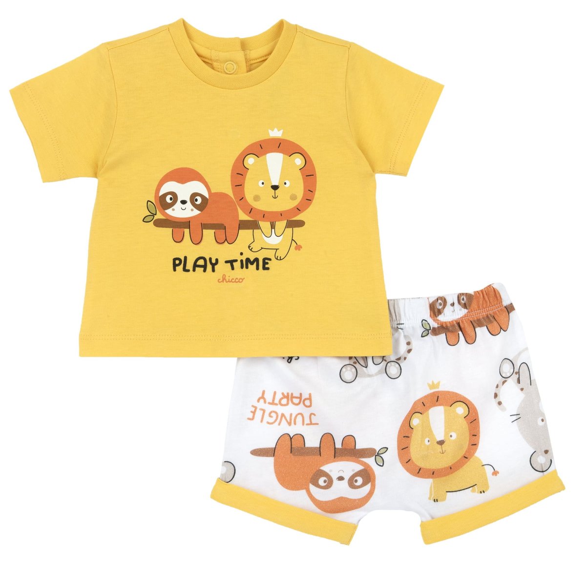 Completo CHICCO in cotone composto da:-T-shirt girocollo mezza manica con fantasia jungle stampata chiusura clips sul retro.-Bermuda con elastico in vita e risvolto .