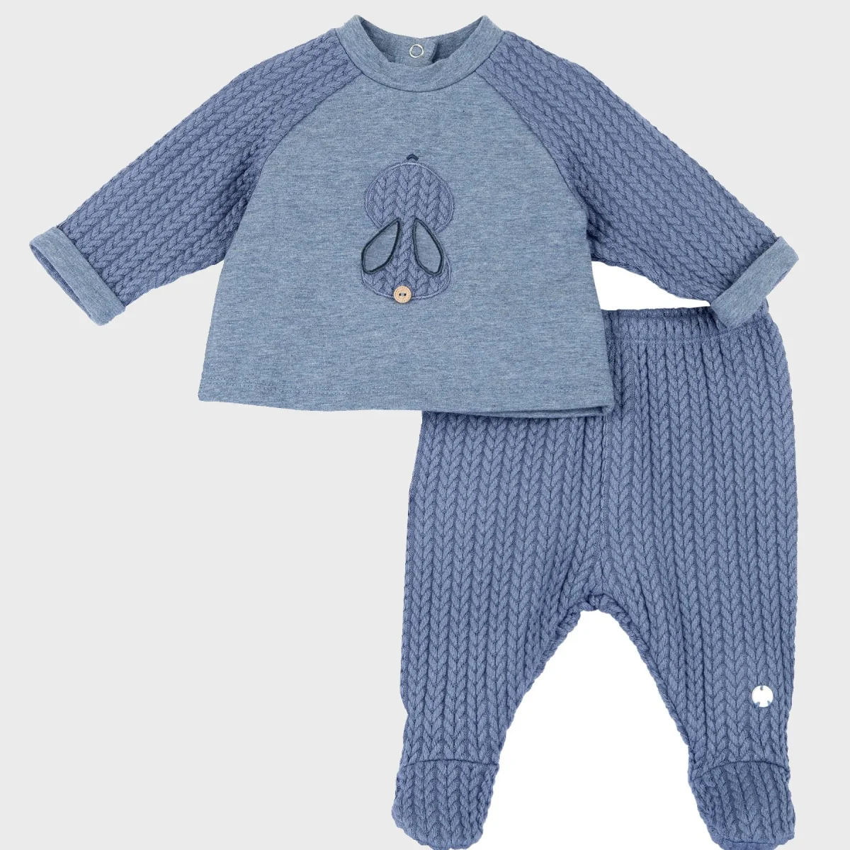 Completo CHICCO in morbido e caldo tessuto con felpa con ricamo e bottoncino applicato, chiusura clips sul retro, ghettina con elastico in vita e logo applicato a rilievo.