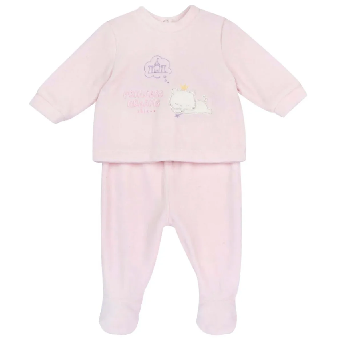 Completo CHICCO in ciniglia rosa , con gattina ricamata , composta da casacca e ghettina. Chiusura con clips.