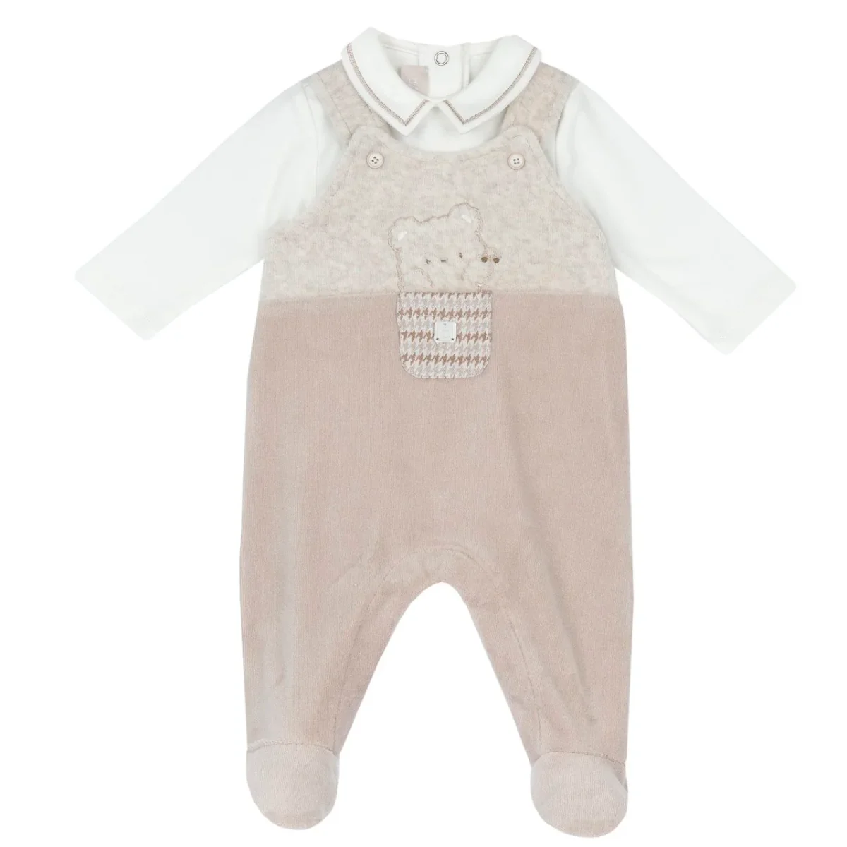 Completo CHICCO neonato salopette in ciniglia e body in interlock tema orsetto.