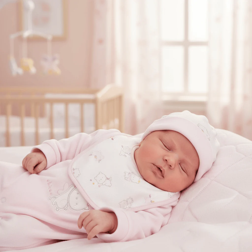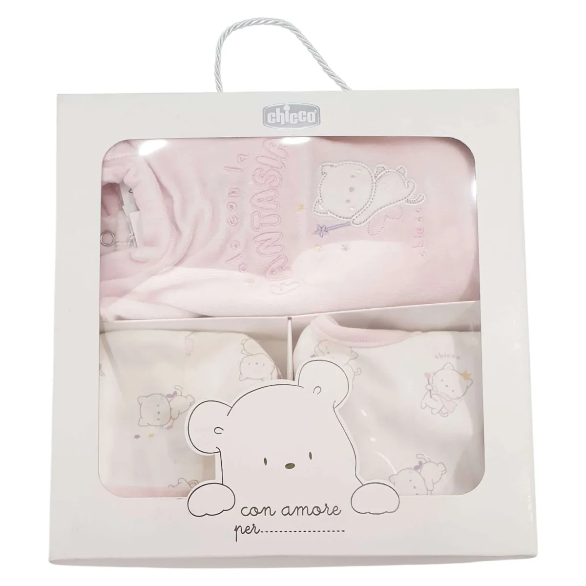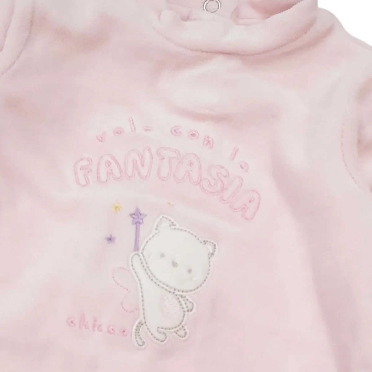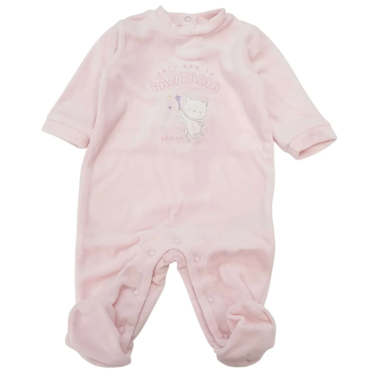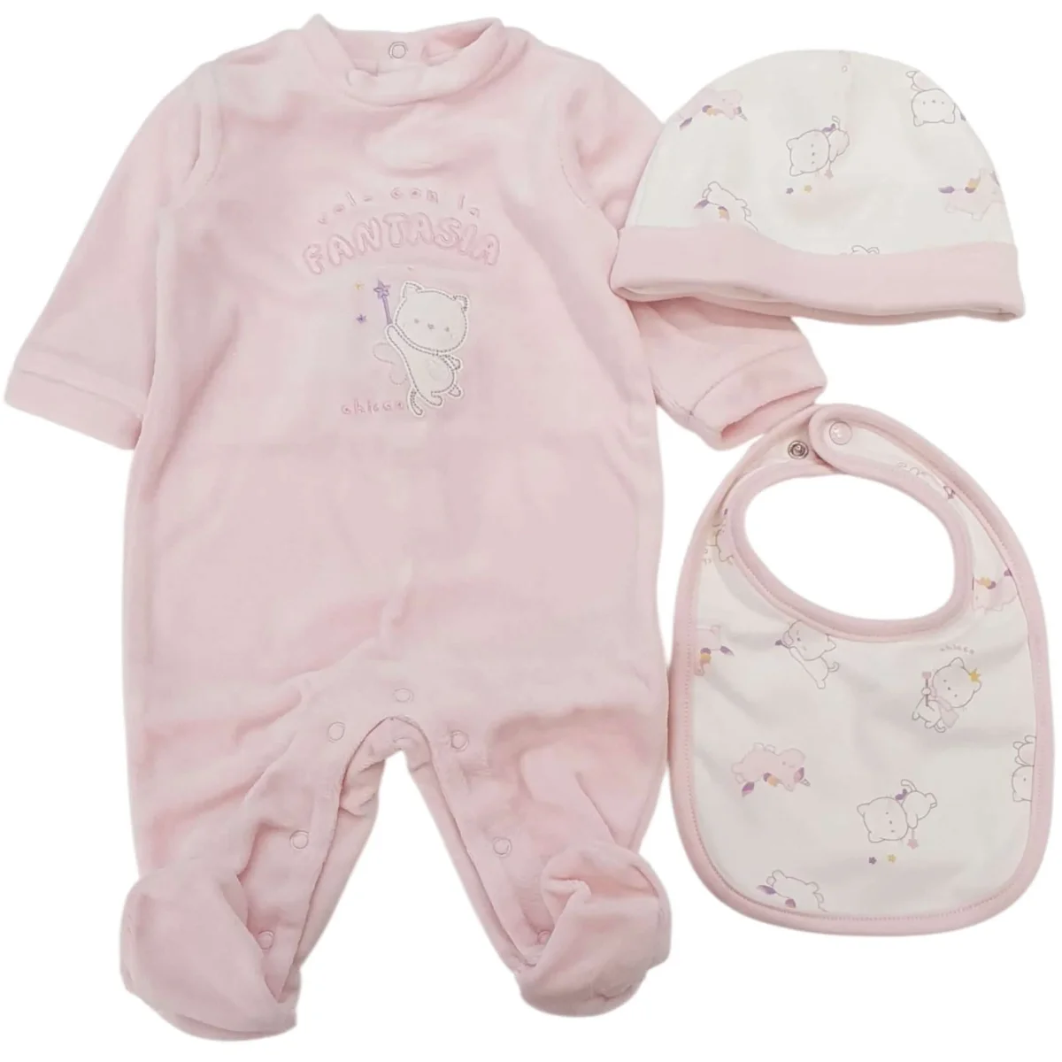 Completo CHICCO composto da tutina in ciniglia con ricamo , cappello e bavetta in cotone .