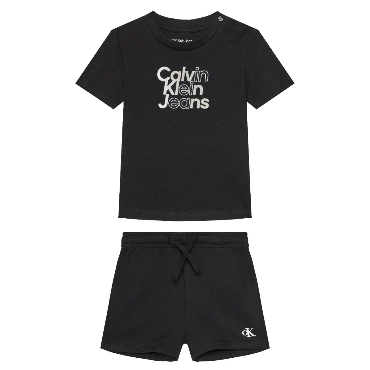 Completo CALVIN KLEIN in cotone composto da t-shirt con logo a rilievo e chiusura clips su spalla fino alla taglia 24mesi, bermuda in cotone con elastico in vita.
