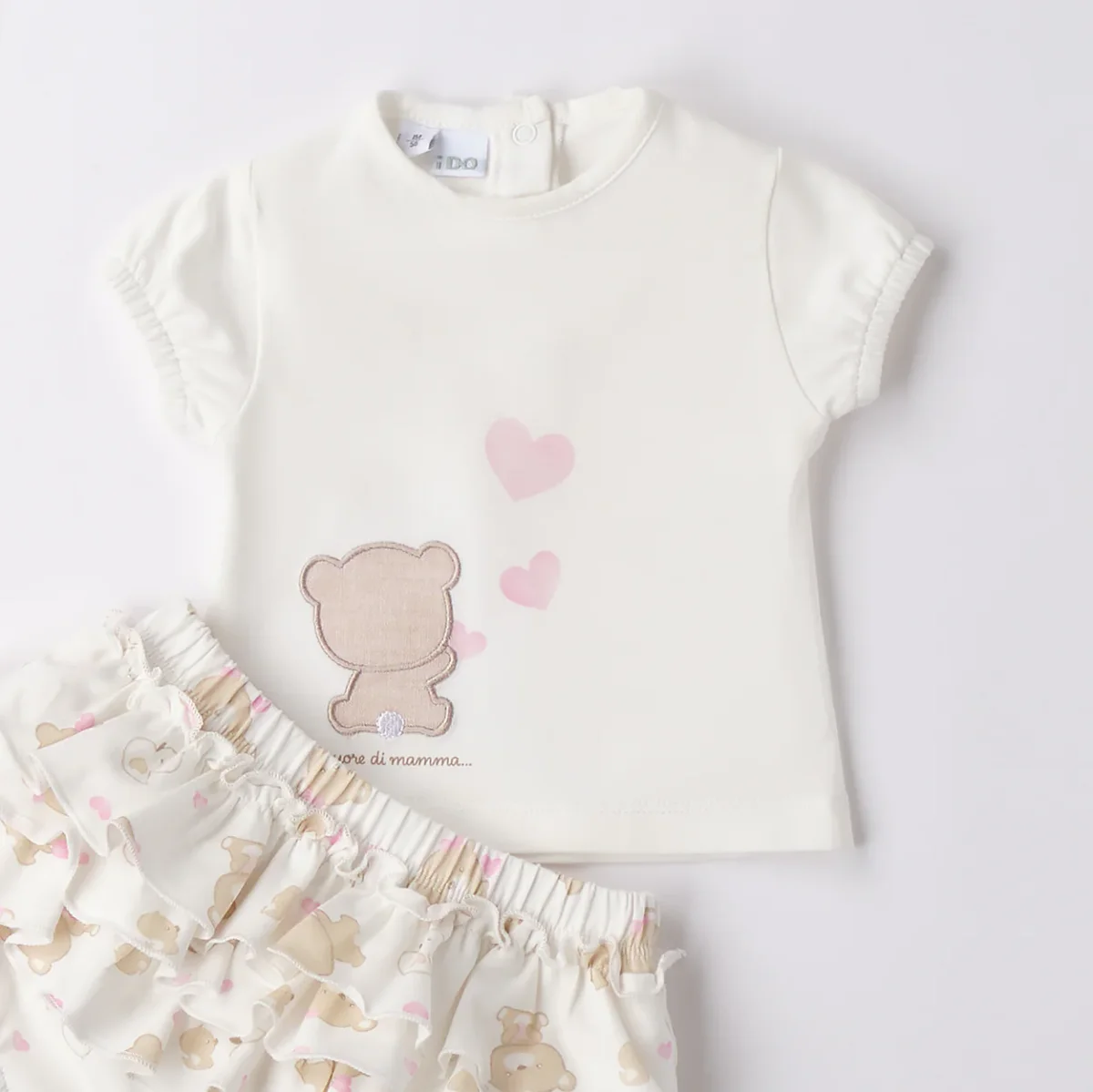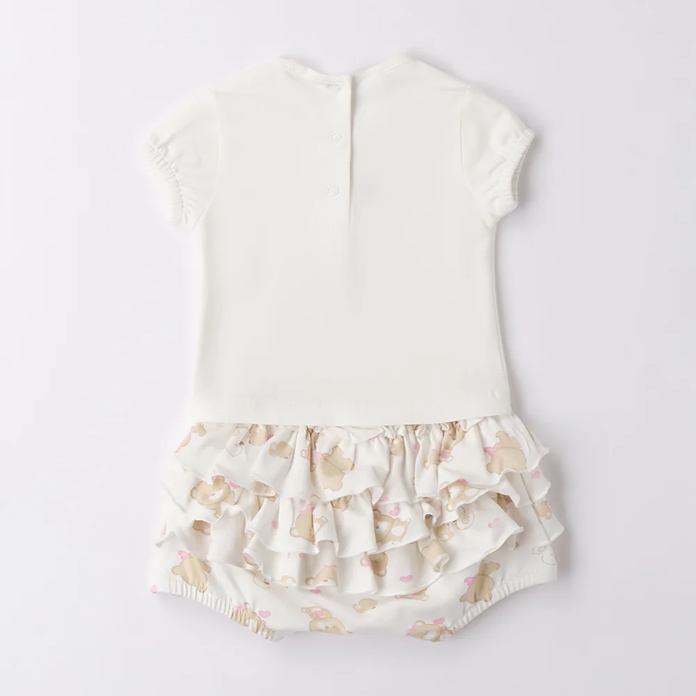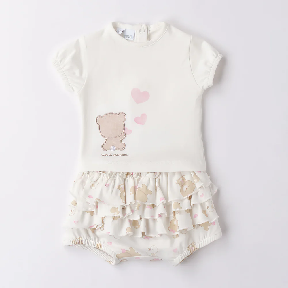 Completo I DO bambina in cotone con stampe a contrasto, parte inferiore multi balze.