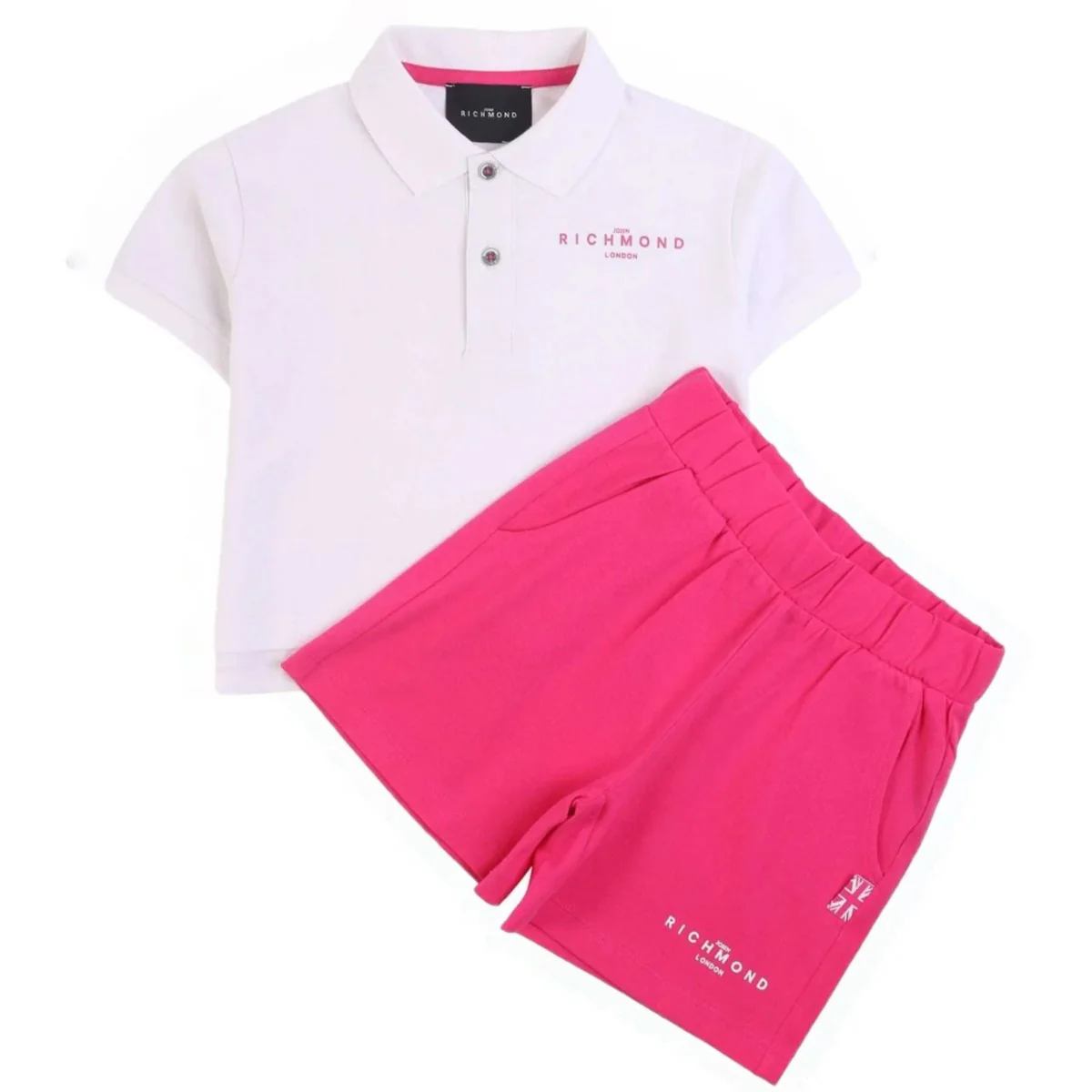 Completo JOHN RICHMOND da bambina in cotone composto da polo modello cropped con stampa a contrasto sia sul retro che frontale e spacchetti laterali ,colletto applicato e chiusura con bottoni ,shorts con elastico in vita e logo stampato a contrasto,tasche laterali .