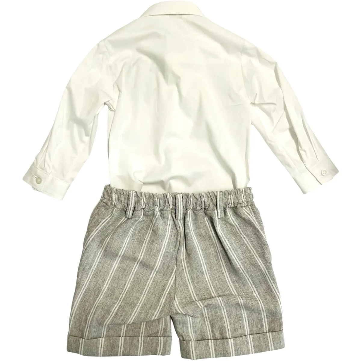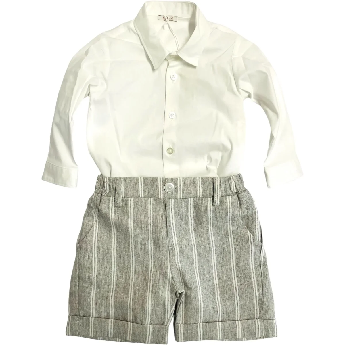 Completo LE BEBE’ bambino composto da, camicia in cotone con ricamo, bermuda coordinato grigio e bianco con elastico in vita.