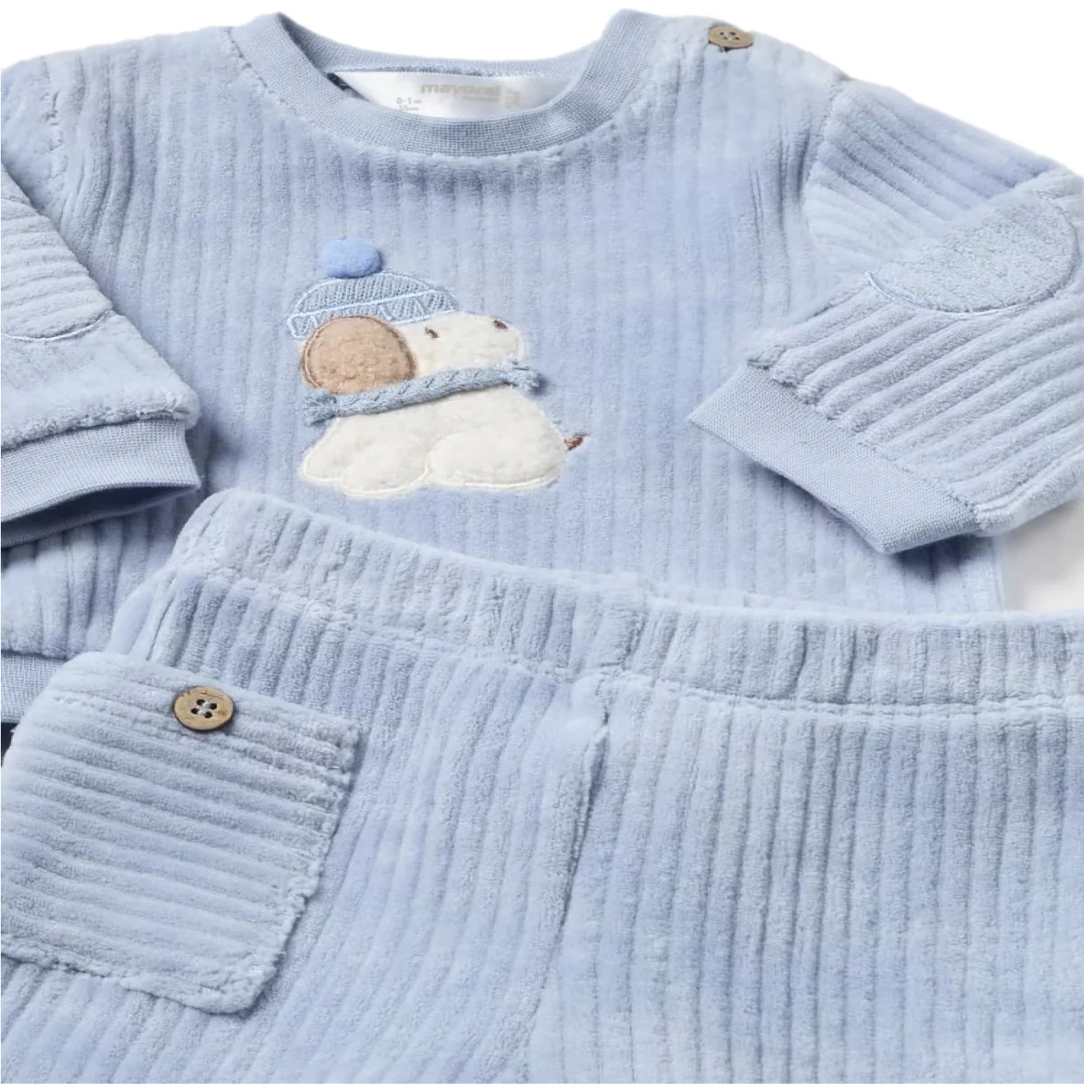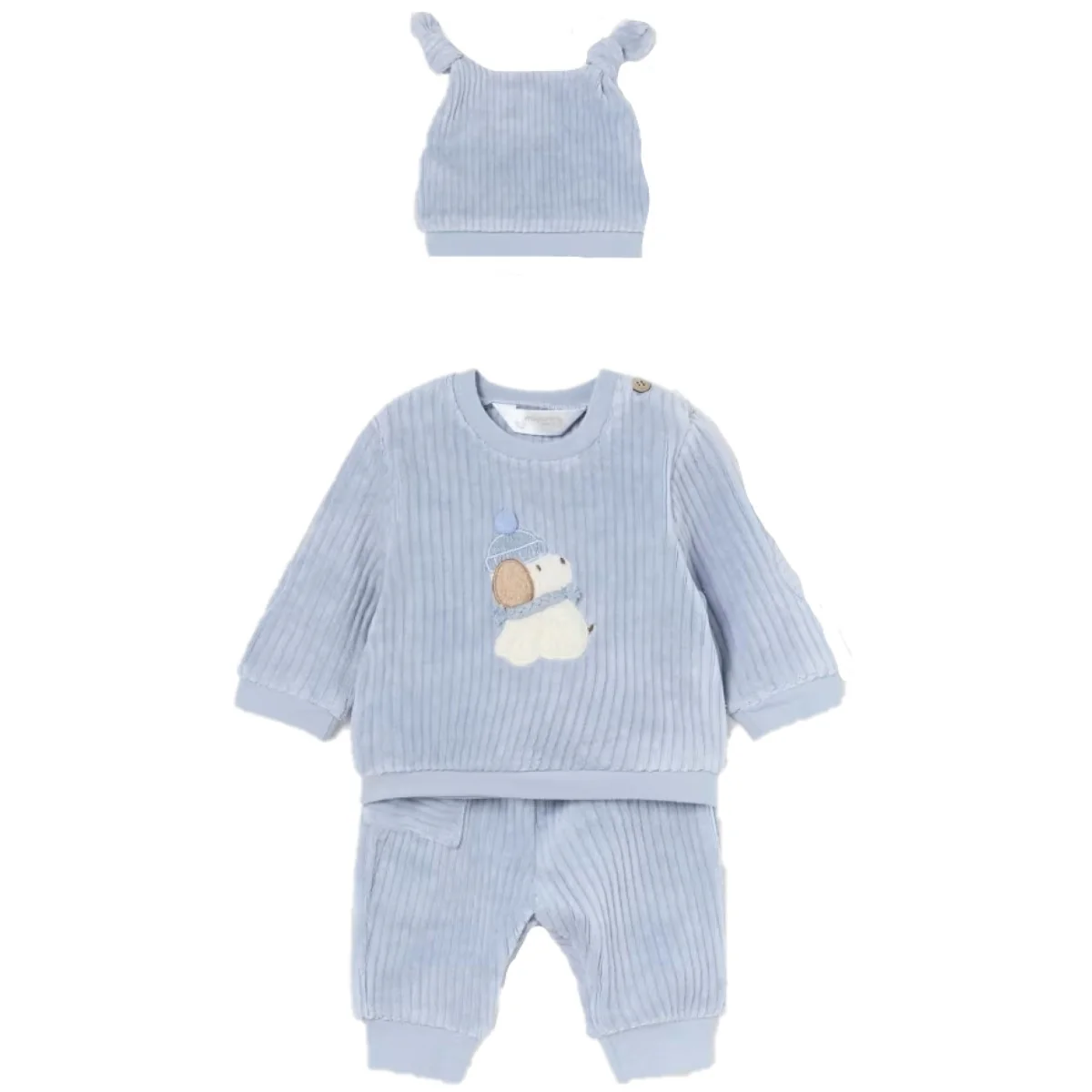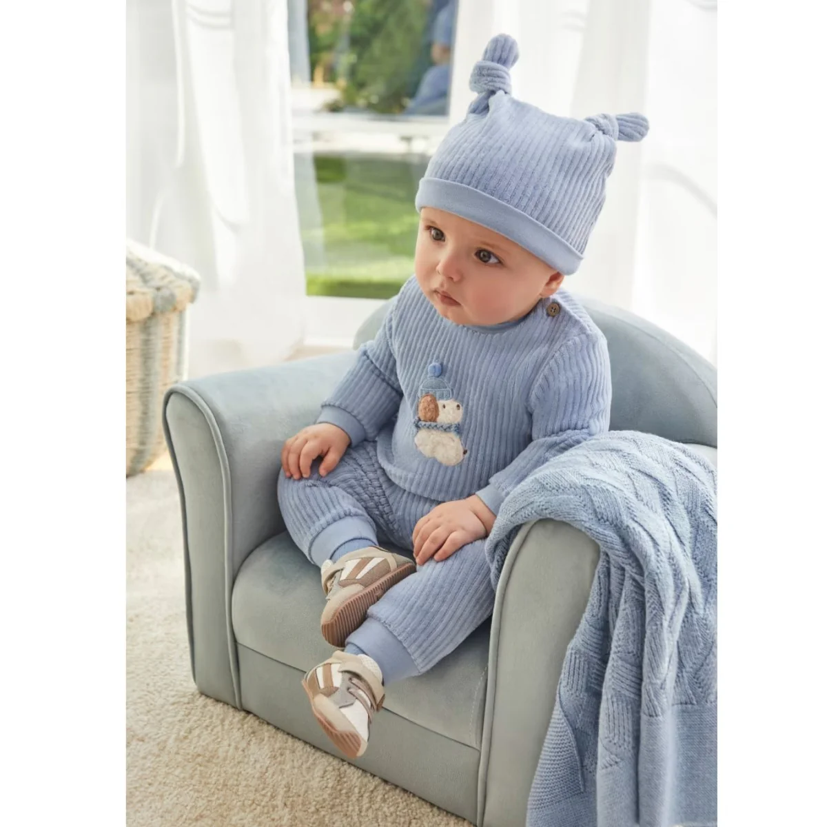 Completo 3 pezzi MAYORAL in ciniglia con parte superiore con patch applicato, chiusura con bottoncino su spalla; pantalone con elastico in vita, taschino laterale con finto bottoncino applicato; cappello con nodini e risvolto.