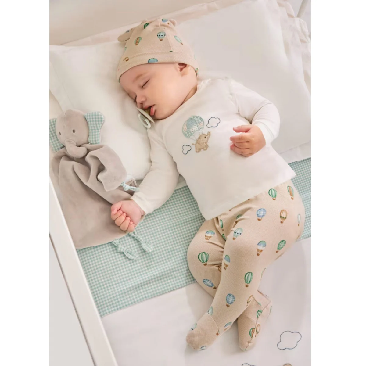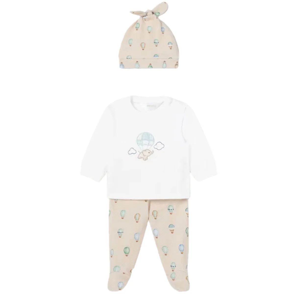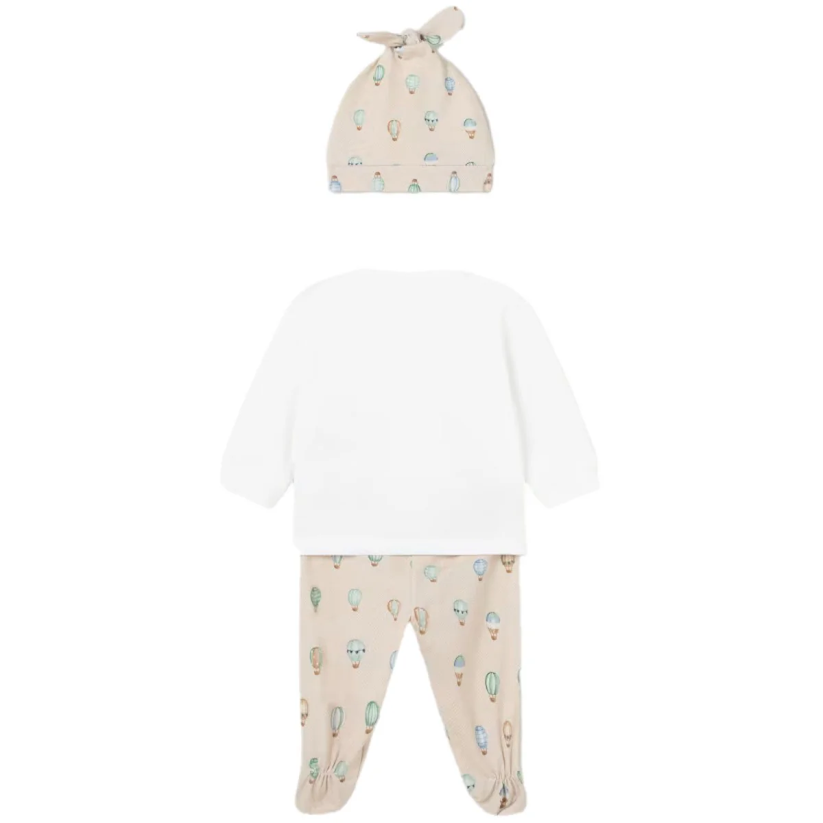 Completo MAYORAL in cotone composto da t-shirt con patch e ricami applicati in colori a contrasto, chiusura con clips laterale, ghettina a fantasia mongolfiere in colori a contrasto con elastico in vita, cappello a fantasia in coordinato con finto nodo applicato.