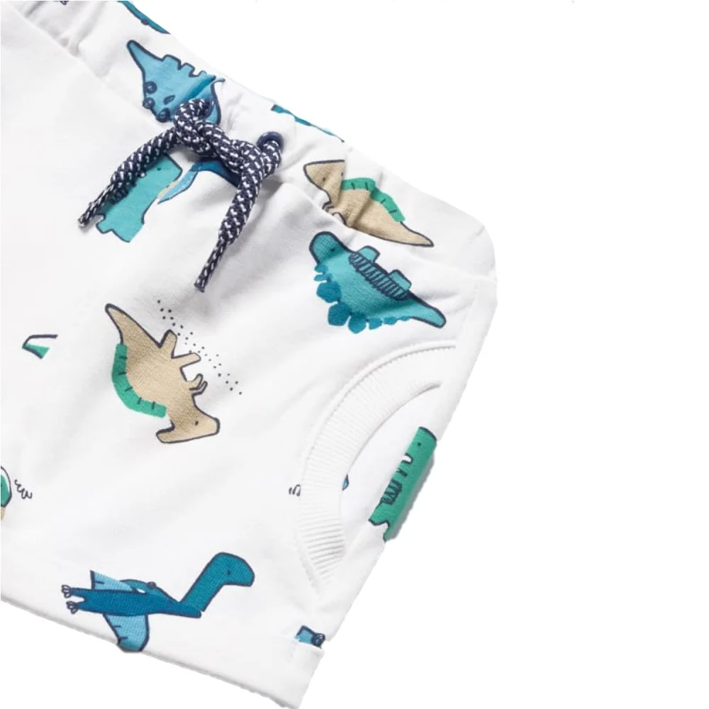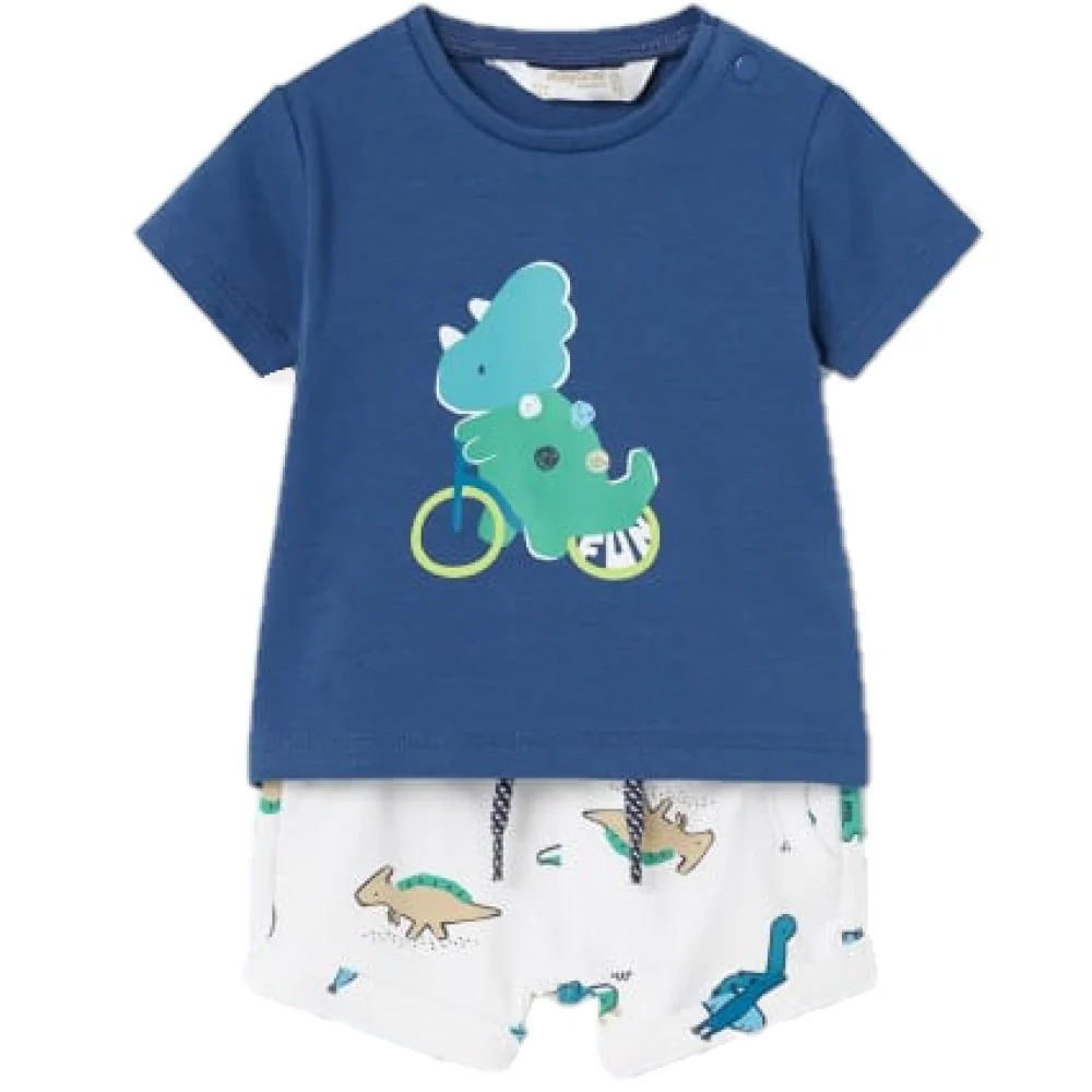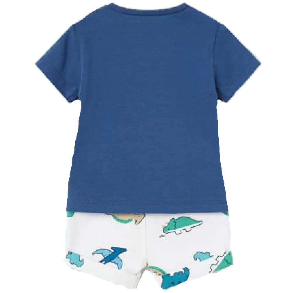 Completo MAYORAL composto da t-shirt in cotone con chiusura clips su spalla bermuda in cotone garzato con stampa dinosauri finti taschini laterali elastico in vita e laccetto.Composizione