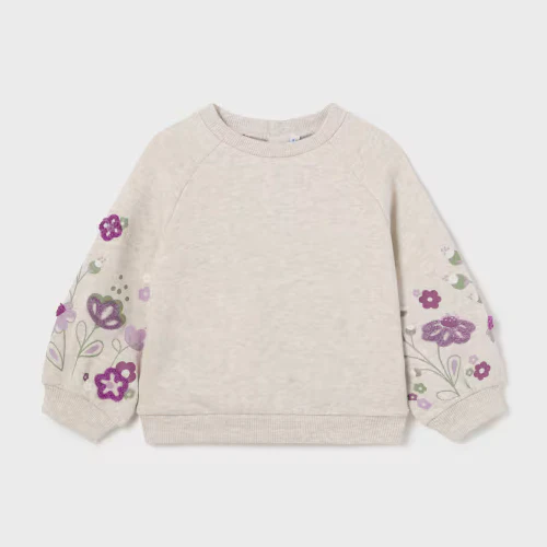 - felpa con stampe e ricami applicati alle maniche in colori a contrasto, chiusura con clips sul retro;
