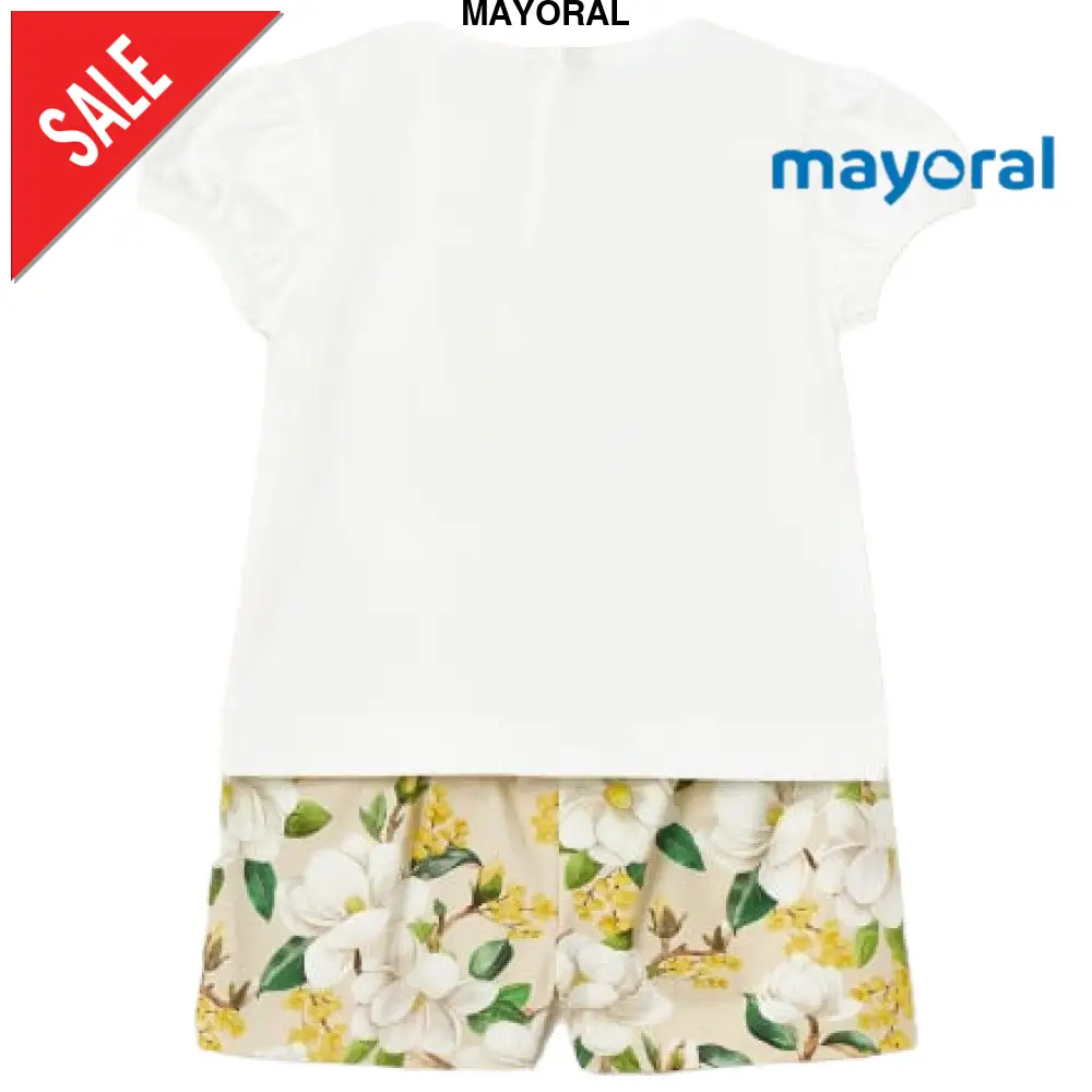 Completo MAYORAL composto da t-shirt in cotone con fiocco applicato chiusura con clips sul retro shorts in cotone con stampa floreale elastico in vita taschini laterali.Composizione