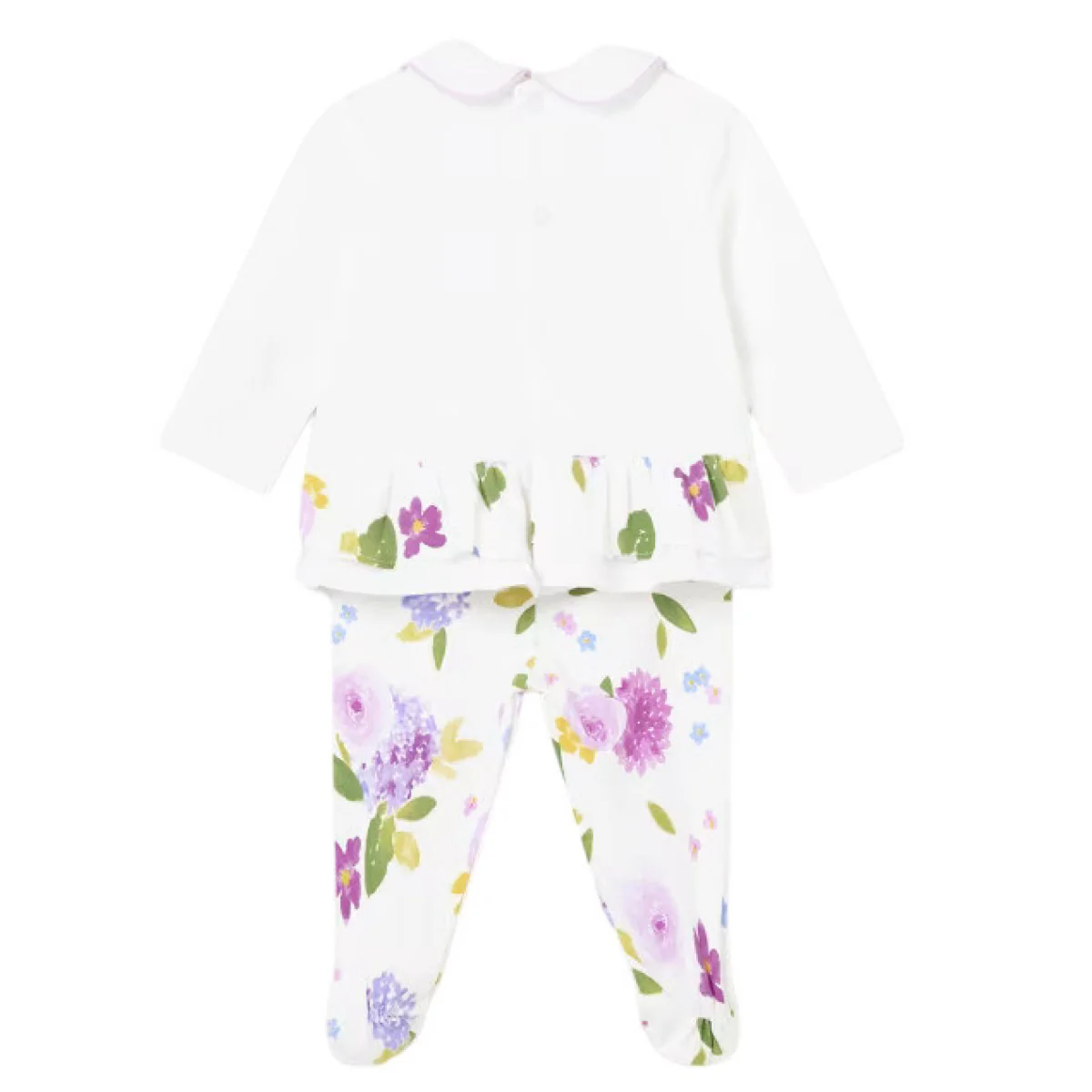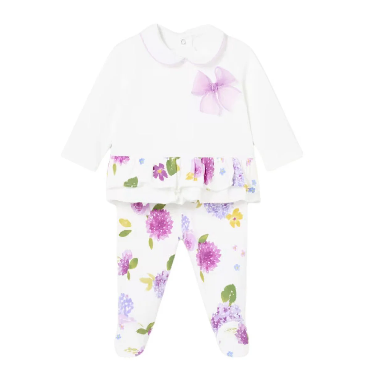 Completo MAYORAL in cotone composto da t-shirt con colletto applicato con rifiniture in colore a contrasto, fiocco applicato in tessuto e colore a contrasto, voilant applicato in vita a fantasia floreale, chiusura con clips sul retro, ghettina a fantasia floreale in colori a contrasto con fascia elastica in vita.