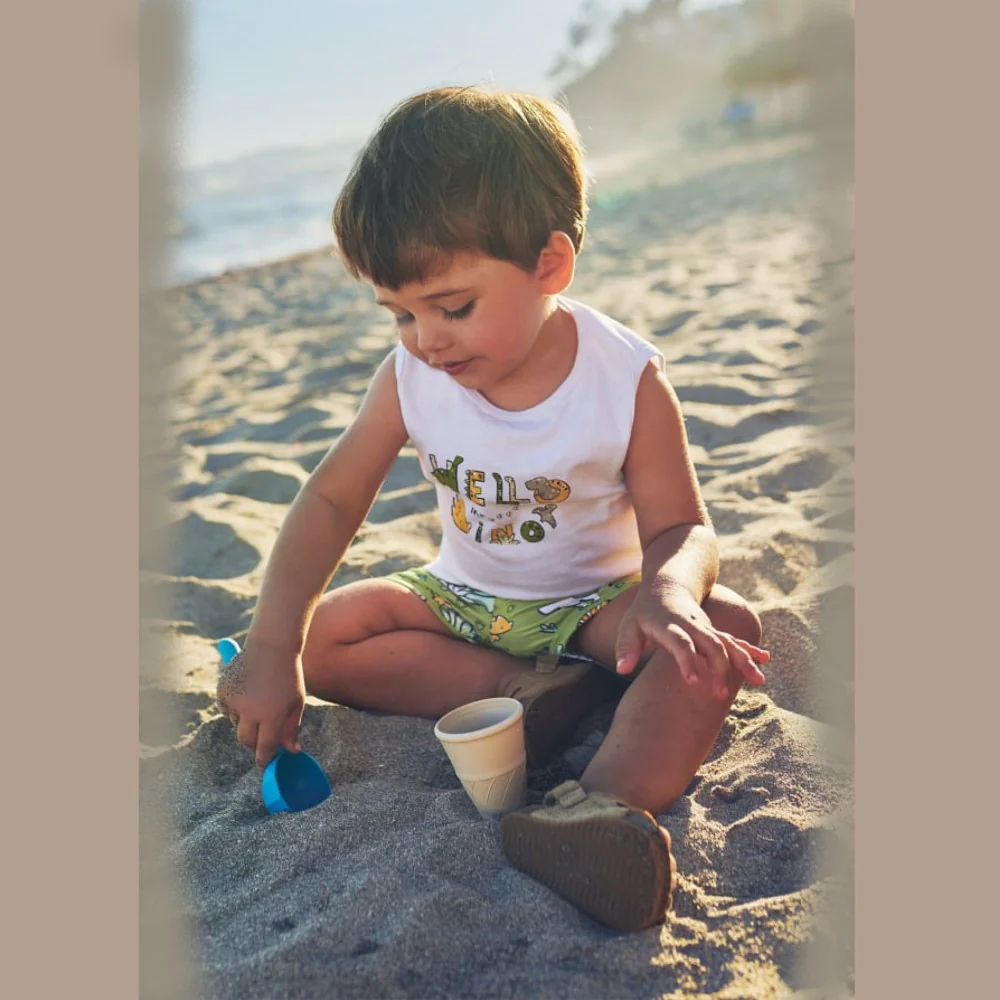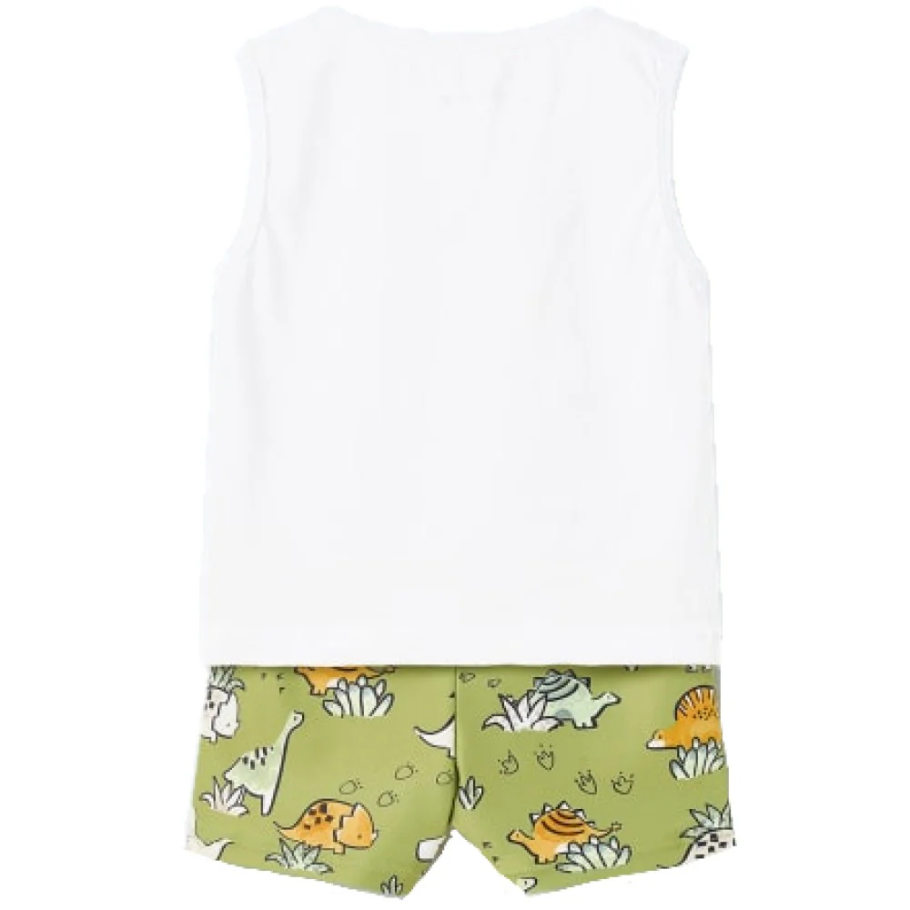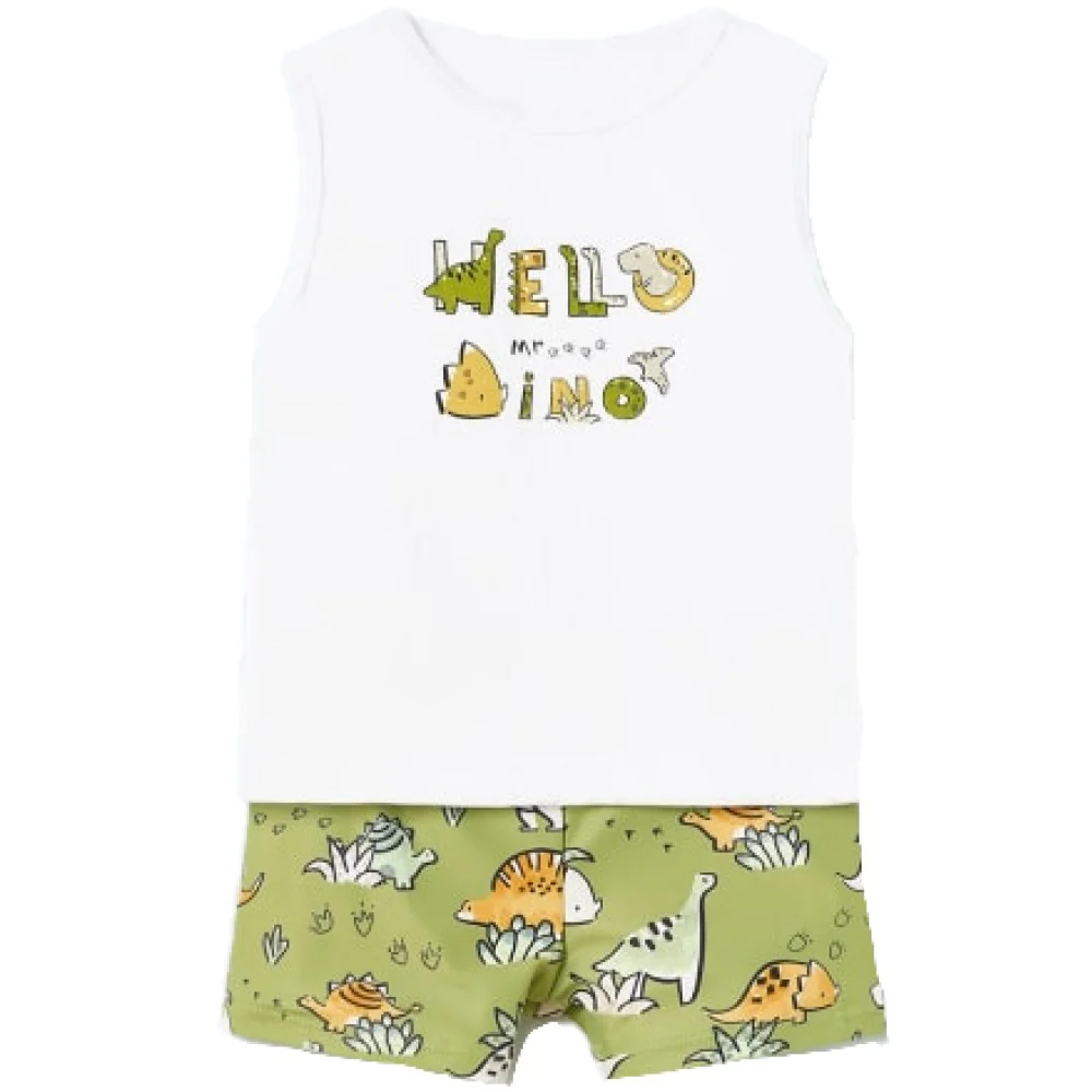 Completo MAYORAL composto da t-shirt modello canotta in cotone e costume modello bermuda in tessuto a fantasia con elastico in vita e laccetto.ComposizioneT-shirt: 99% Cotone 1% ElastanCostume:85% Poliestere15% Elastan