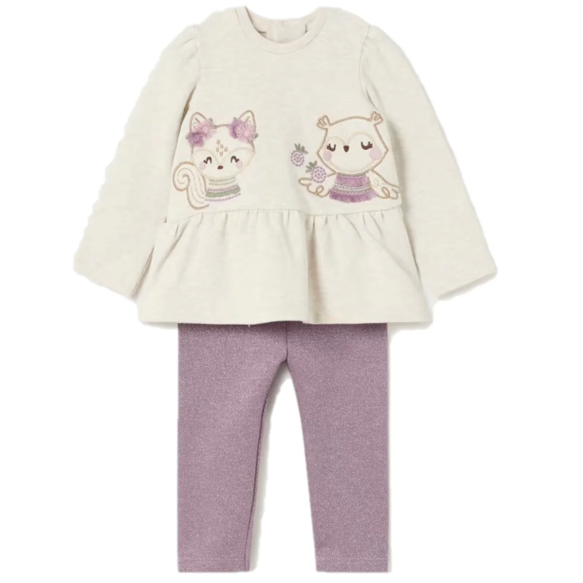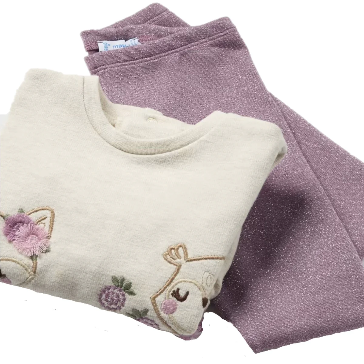 Completo MAYORAL composto da felpa con patch e ricami applicati in colori a contrasto, chiusura con clips sul retro; leggings in lurex con elastico in vita.