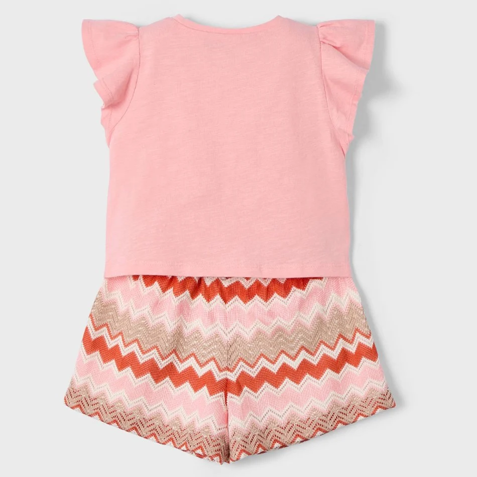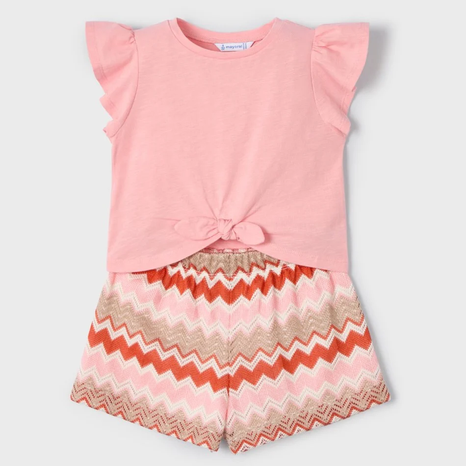 Completo MAYORAL composto da t-shirt in cotone modello girocollo con manica corta a sbuffo e finto fiocco applicato nella parte anteriore, shorts in tessuto lavorato a fantasia zigzag con elastico in vita ,foderato in cotone.